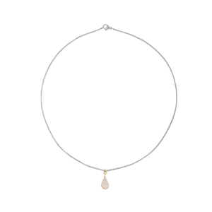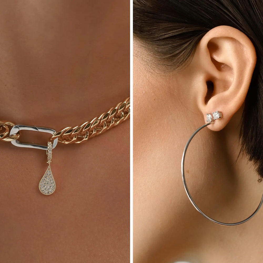 The Just Click Drop Charm’s neckline fit and dainty pendant introduces a two-tone centerpiece, while the sculptural Solitaire hoops balance out the look with sleek silver geometry.