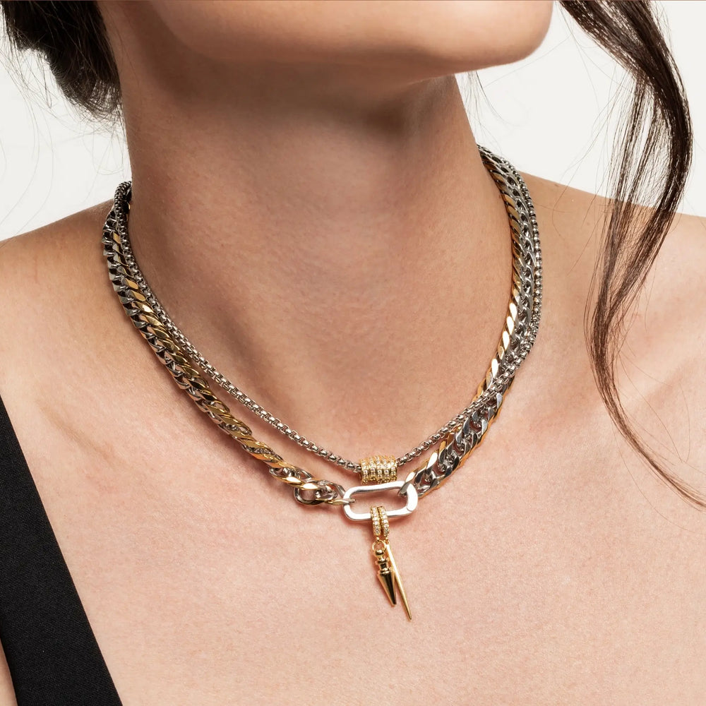 This one-and-done necklace is already stacked with two chains in mixed textures and tones. It’s balanced, bold and built to blend metals without second-guessing.