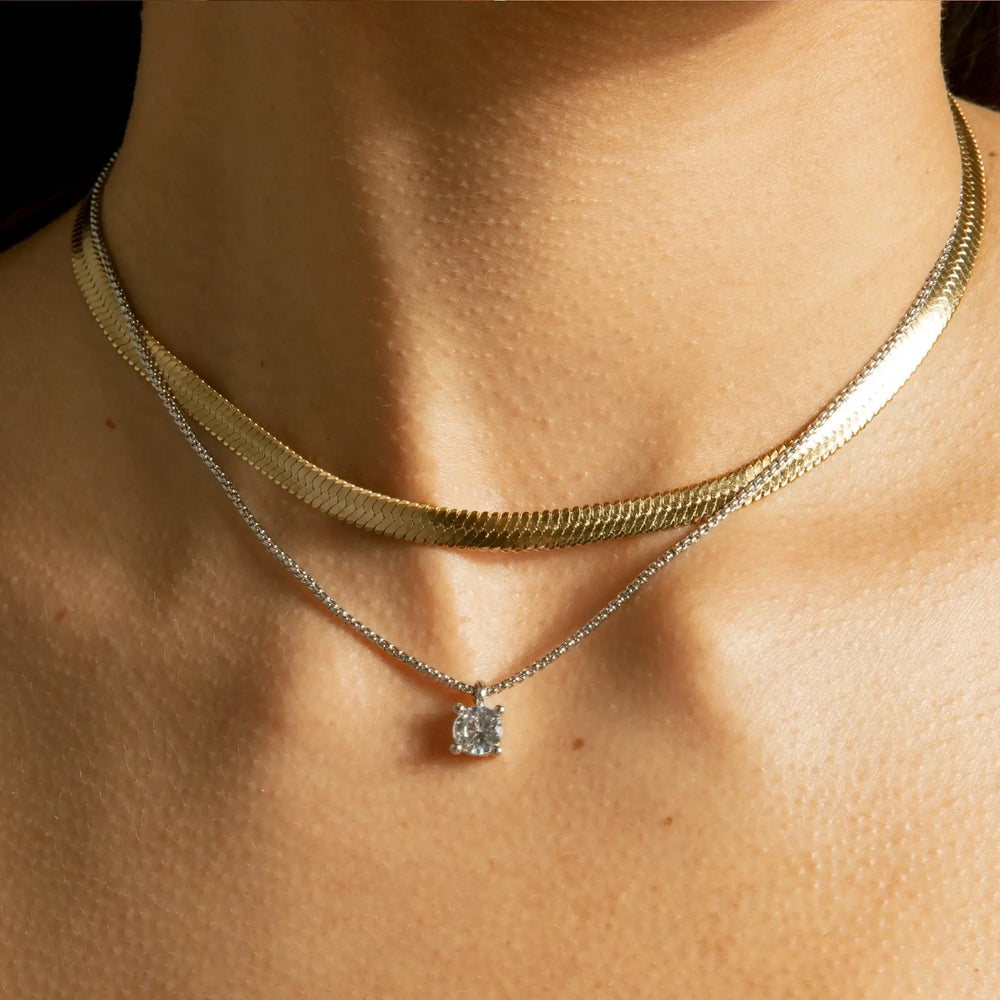 The Solitaire’s icy silver pairs beautifully with the warm, tight links of the Viper Snake Chain.