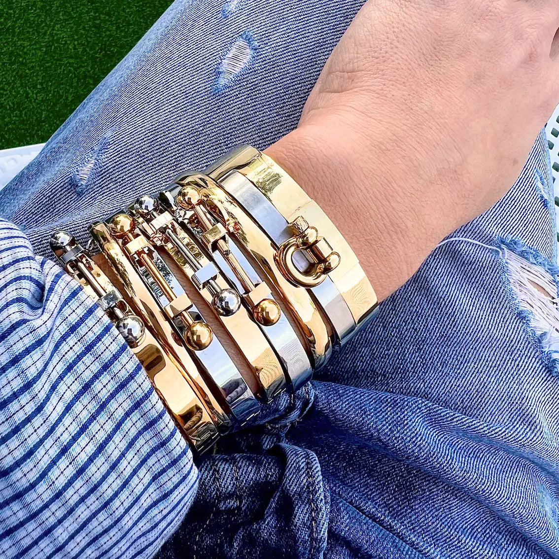 The COINS BANGLE is highly regarded for its exceptional quality and beauty, fitting wrists up to 6.34 inches. Made from stainless steel and plated with 18k gold, rhodium, and rose gold, it is hypoallergenic and resistant to tarnish and rust.
