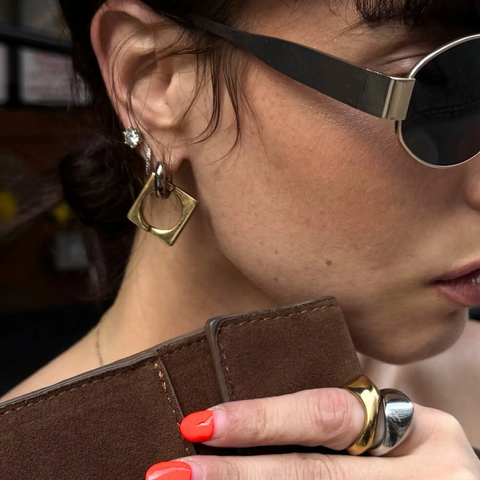 Gold and silver **Square Mix Hoops Earrings**, styled with three stacked gold and silver rings, including a diamond ring, for a modern and edgy look.