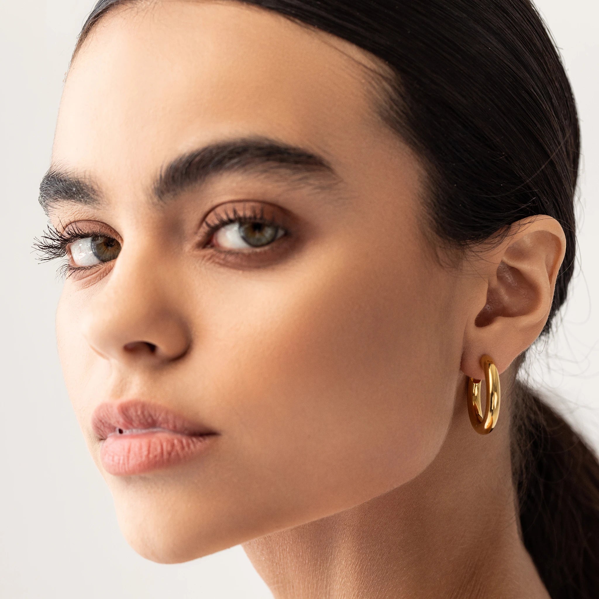 These Slim Bagel Hoops are the perfect everyday accessory. Wear them to elevate a casual look or with your favorite black dress to create a stylish, modern style. Made from 18k Gold Plated Stainless Steel.