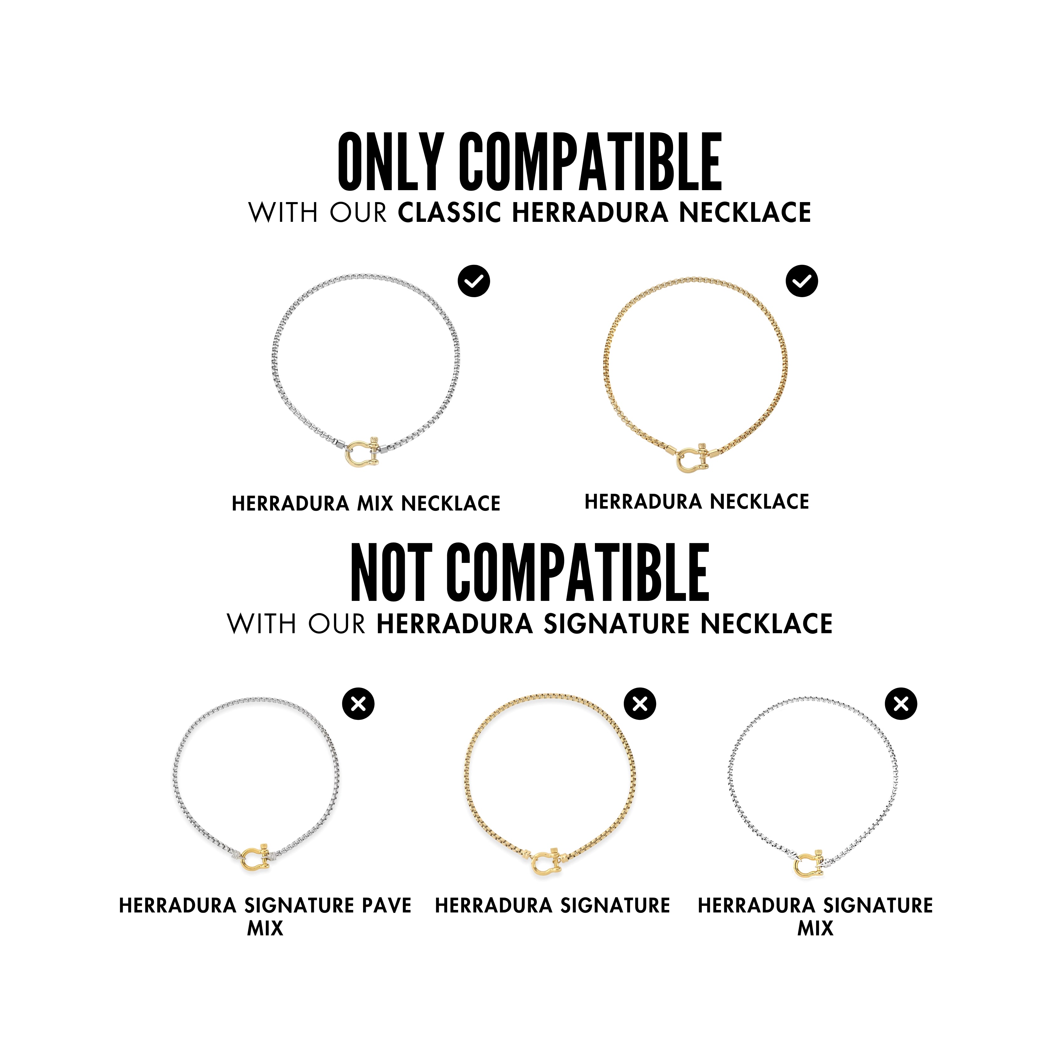 "Compatibility guide for Artizan Joyeria Jewelry showing necklaces compatible and not compatible with the Herradura Signature Necklace, including the Herradura Signature Pavé Mix, Herradura Signature, and Herradura Signature Mix as compatible options, and the Herradura Mix Necklace and Herradura Necklace as non-compatible."