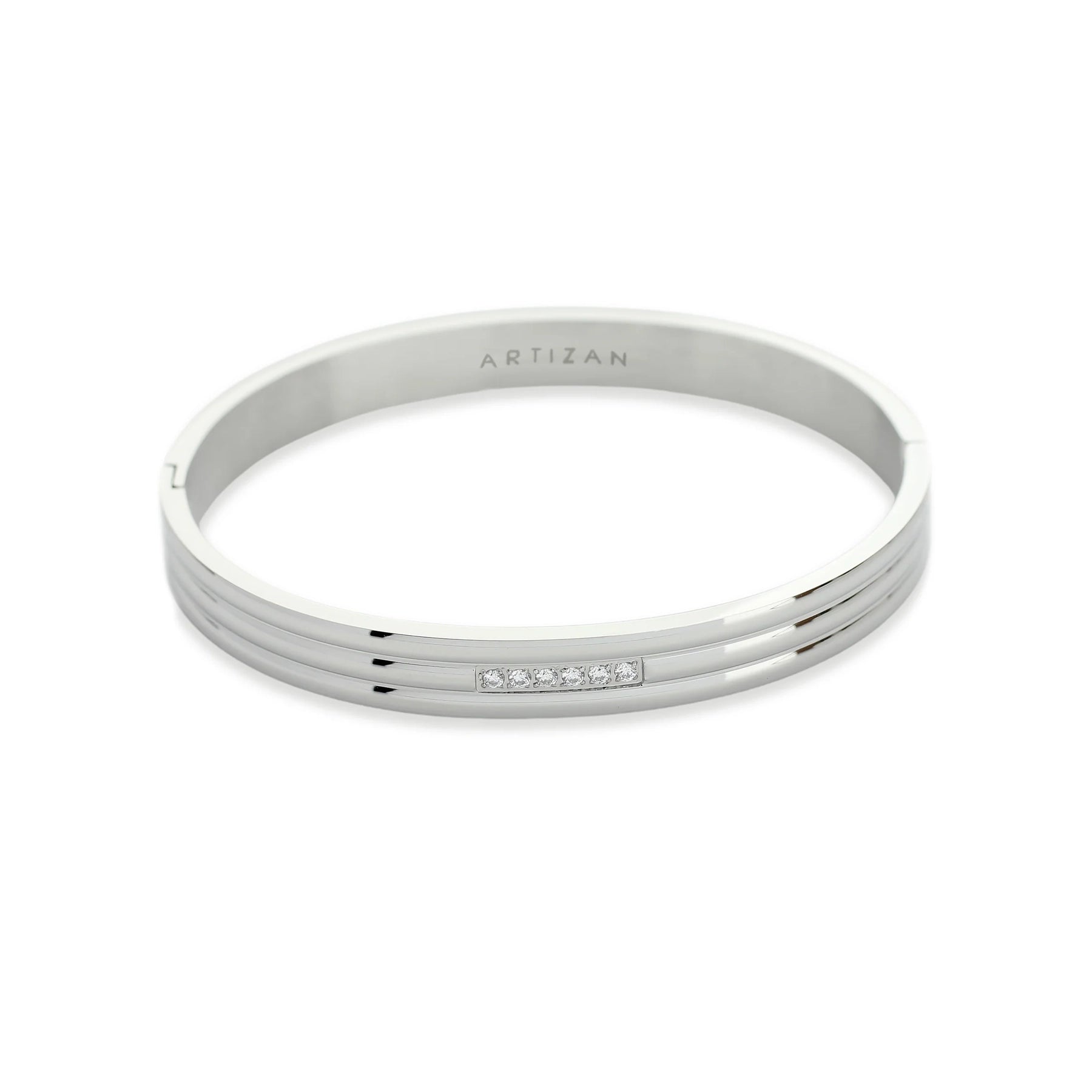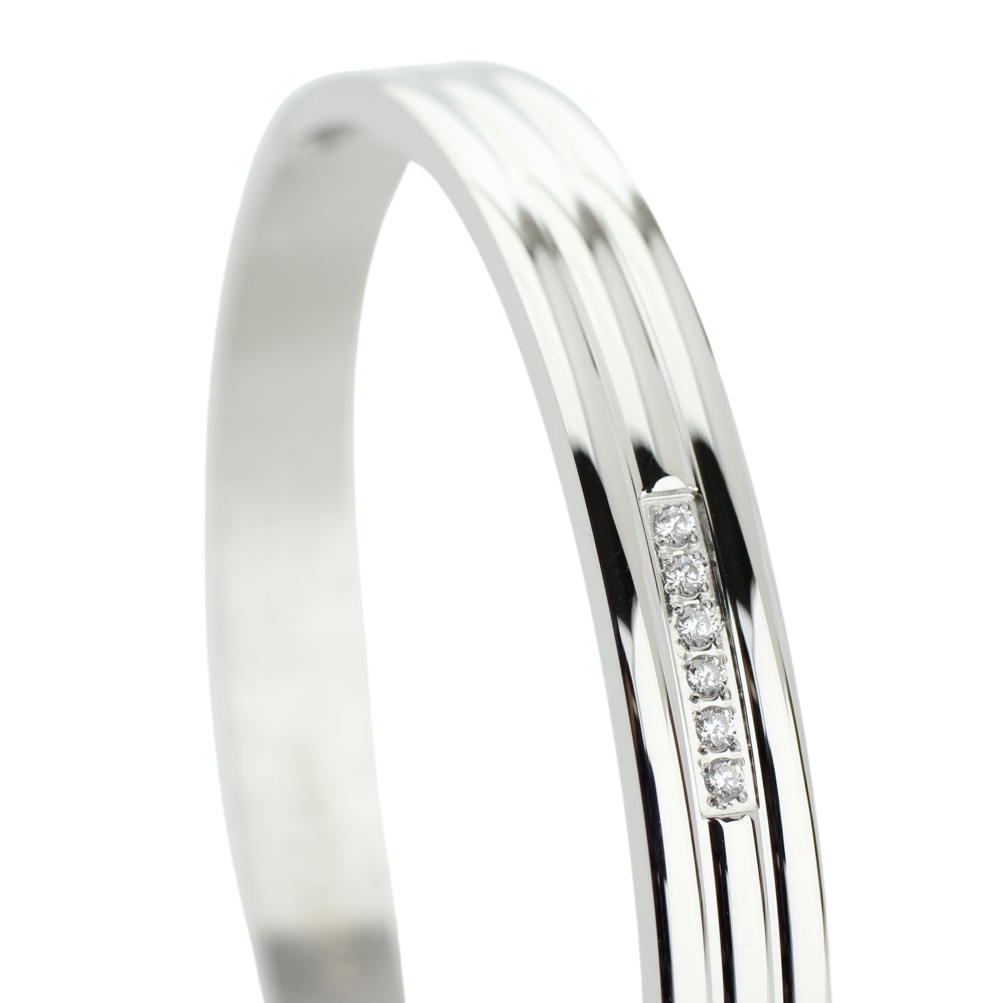 The LANE BANGLE which is made of rhodium plated stainless steel with six tiny cubic zirconia.