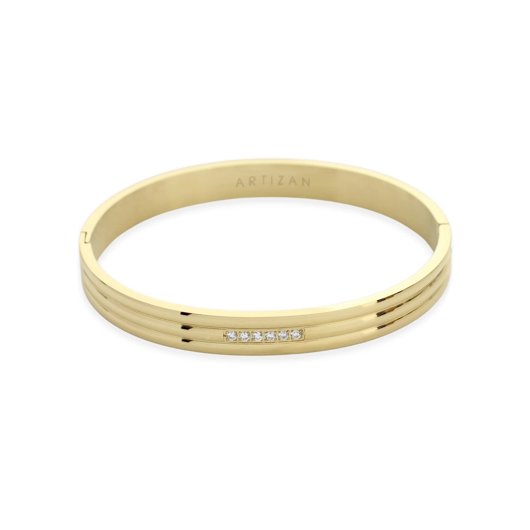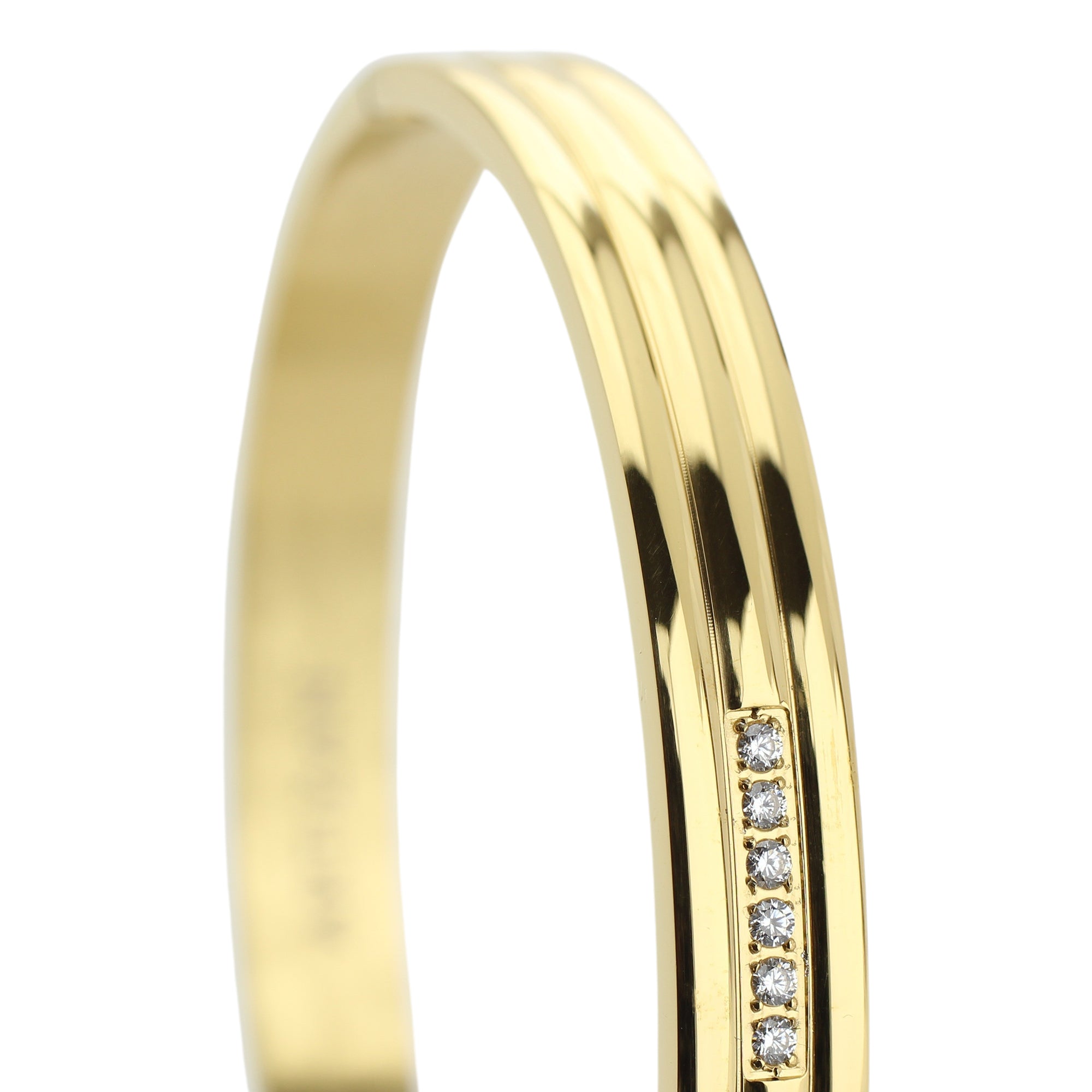 The Lane Bangle, a polished gold bangle featuring a sleek, minimalist design with a subtle row of sparkling stones on the front. This elegant bracelet can be worn solo or stacked with other bangles for a refined, sophisticated look, perfect for both casual and formal occasions.