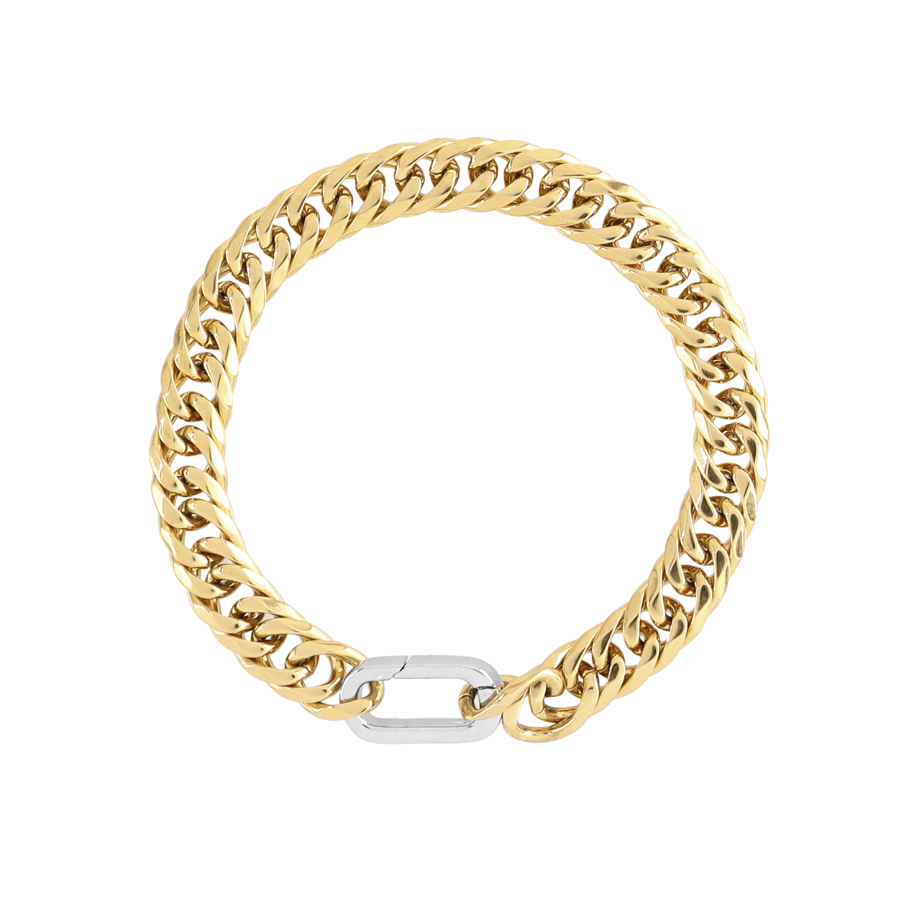The Just Click Bracelet, a single bold gold chain bracelet with a distinctive silver link clasp, combining classic curb chain style with a modern twist. This two-tone piece stands out as a statement accessory, perfect for layering or wearing solo for a sleek, contemporary look. ||| MIX