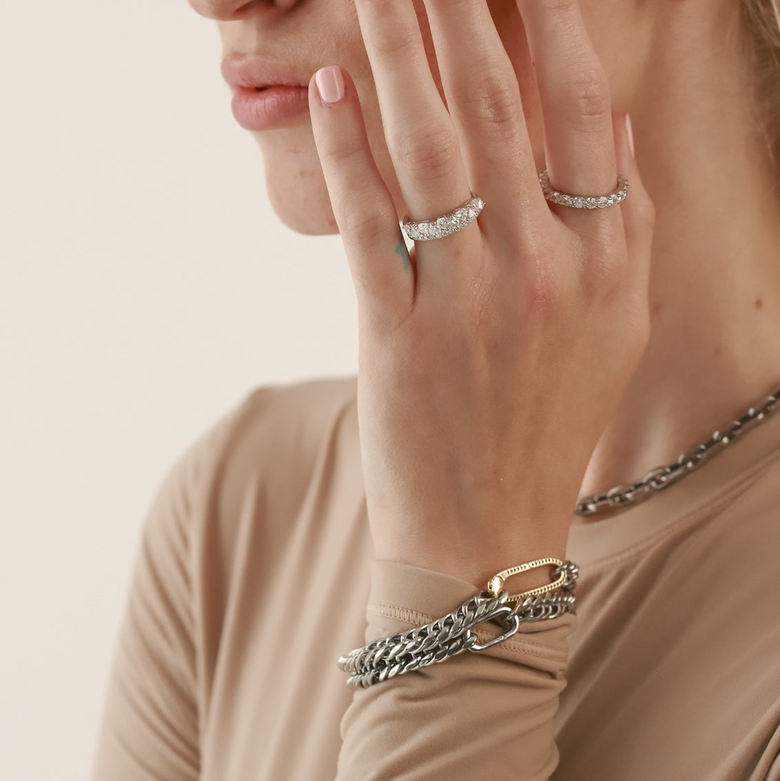 Model wearing multiple CARABINER SQUARE PUERTO BRACELET and CARABINER PUERTO BRACELET. They are chunky square link chain and made from gold-plated stainless steel. ||| SILVER