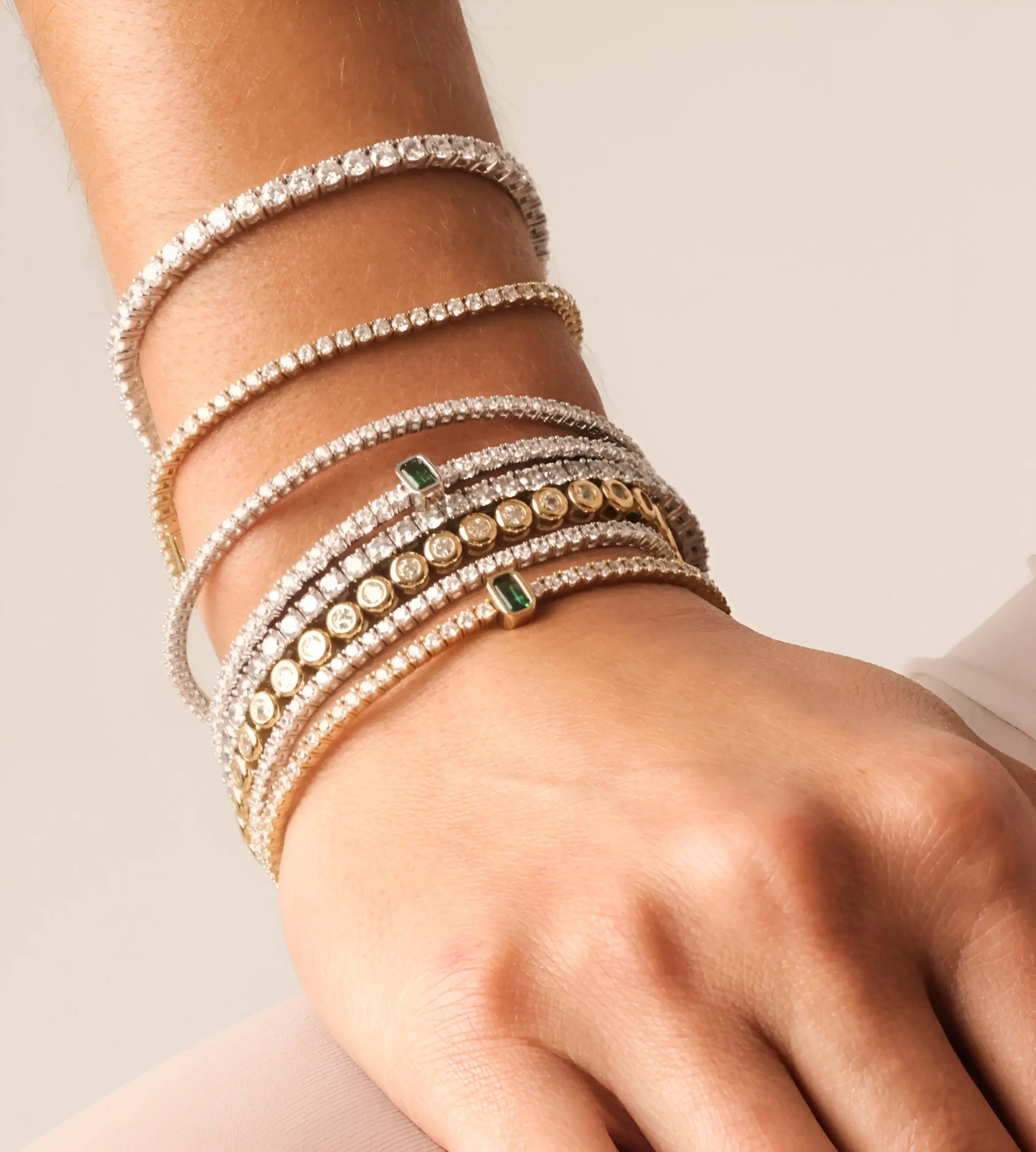 Close-up of The Bubble Curb Chain Bracelet Stack, a silver layered bracelet set featuring a chunky curb chain and a tennis bracelet with round-cut stones. ||| SILVER