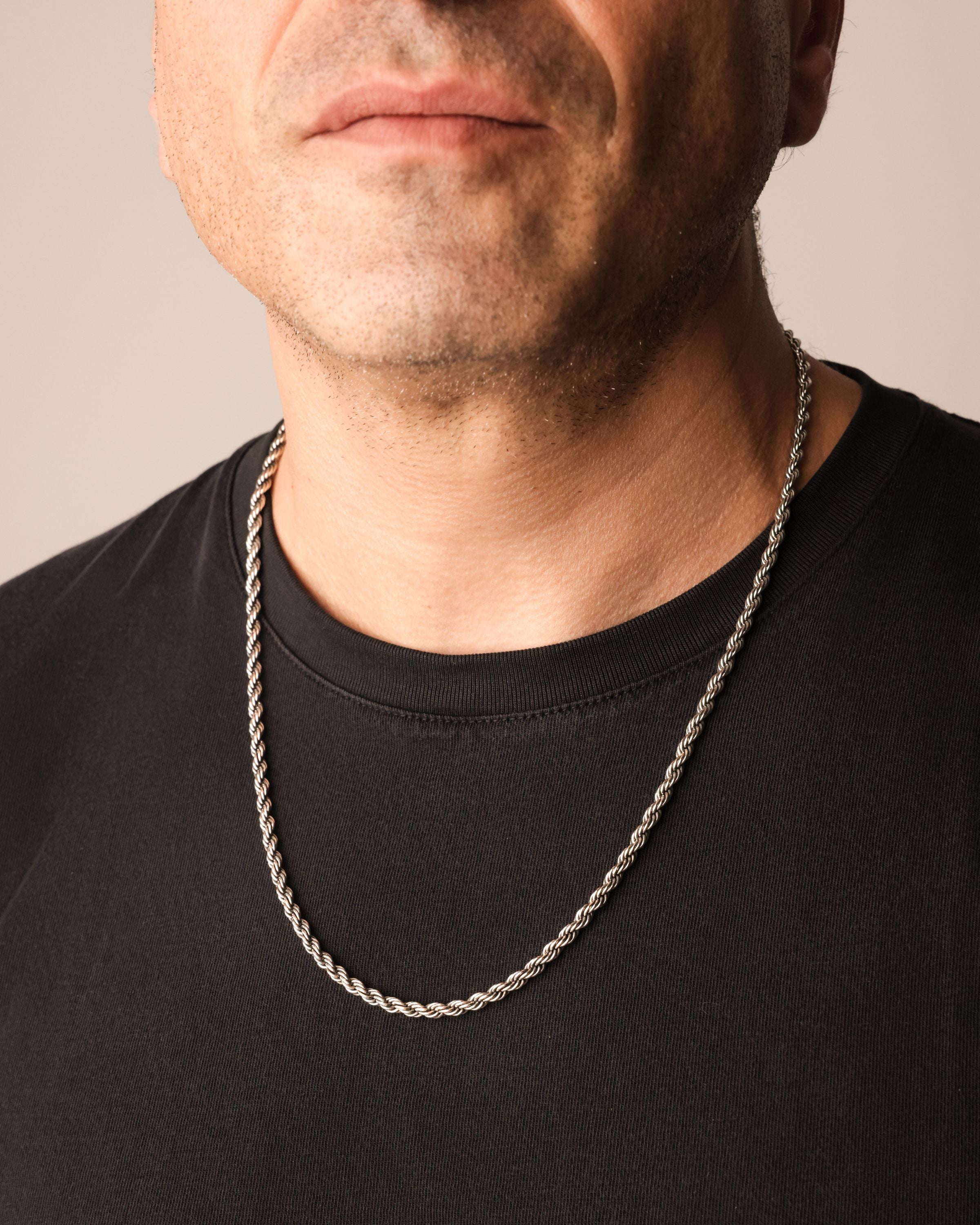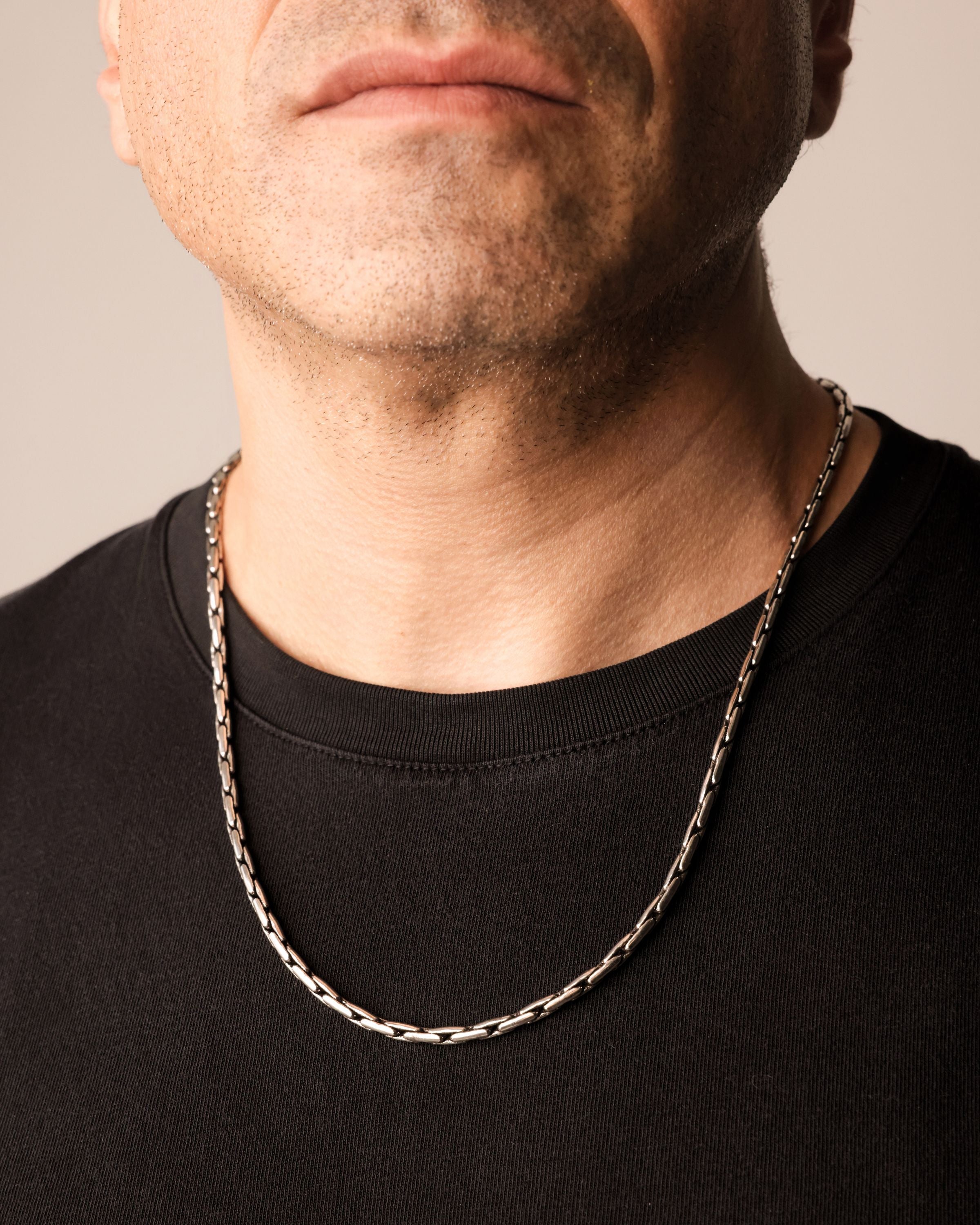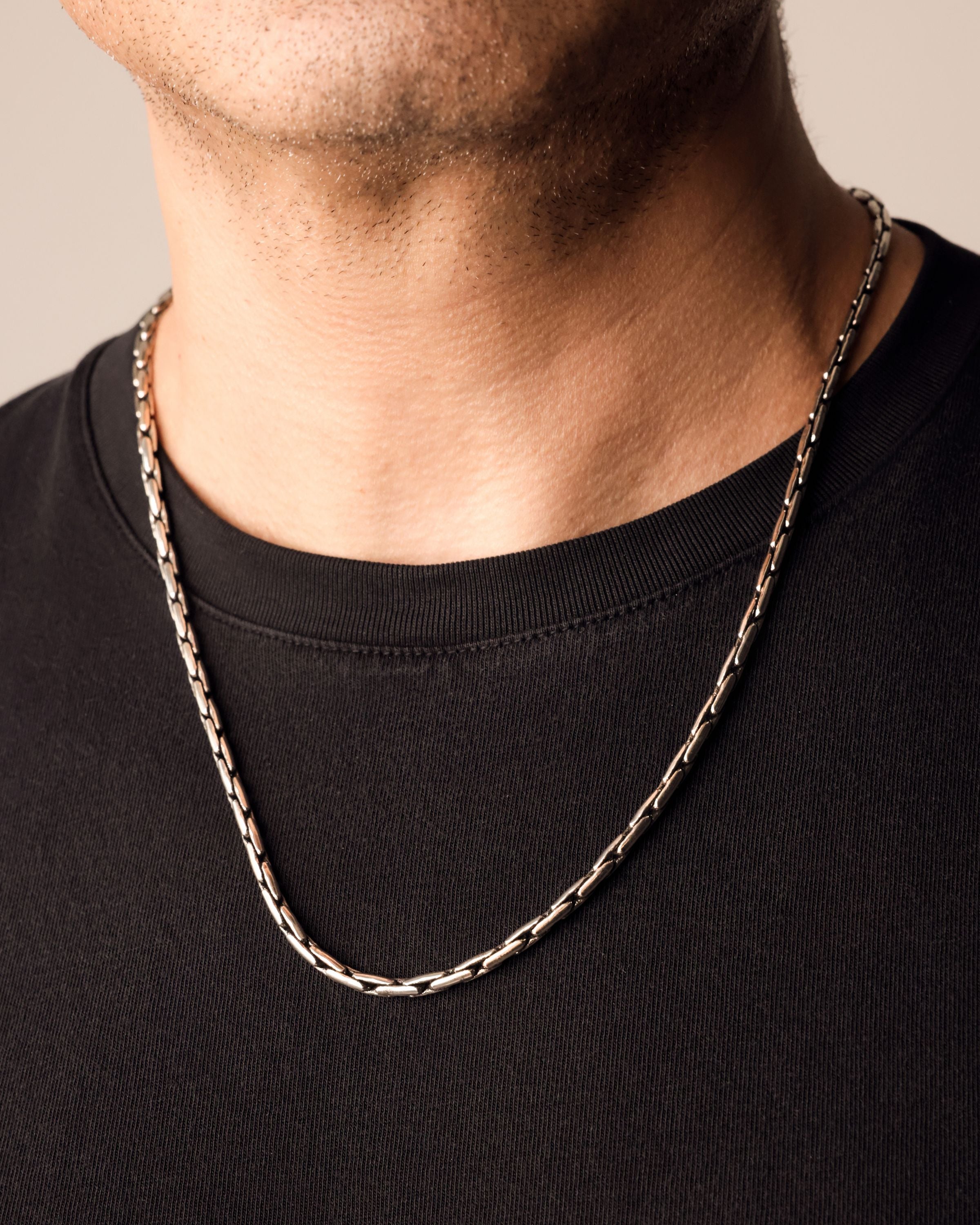 Model wearing the Just Click Letter Chain, a gold chain with a lobster clasp closure and three charms: a diamond-like encrusted letter "X" and two spike charms.
