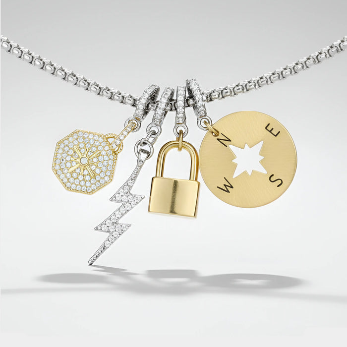 Our charm necklaces are designed to work with a range of styles. You’ll find options like initials and letter necklaces, zodiac, crosses, stars, evil eye motifs, compass charms, emerald details, and modern drop shapes. You can shop necklaces that come styled with charms, or start with a single necklace and add the charms you choose to make it your own.