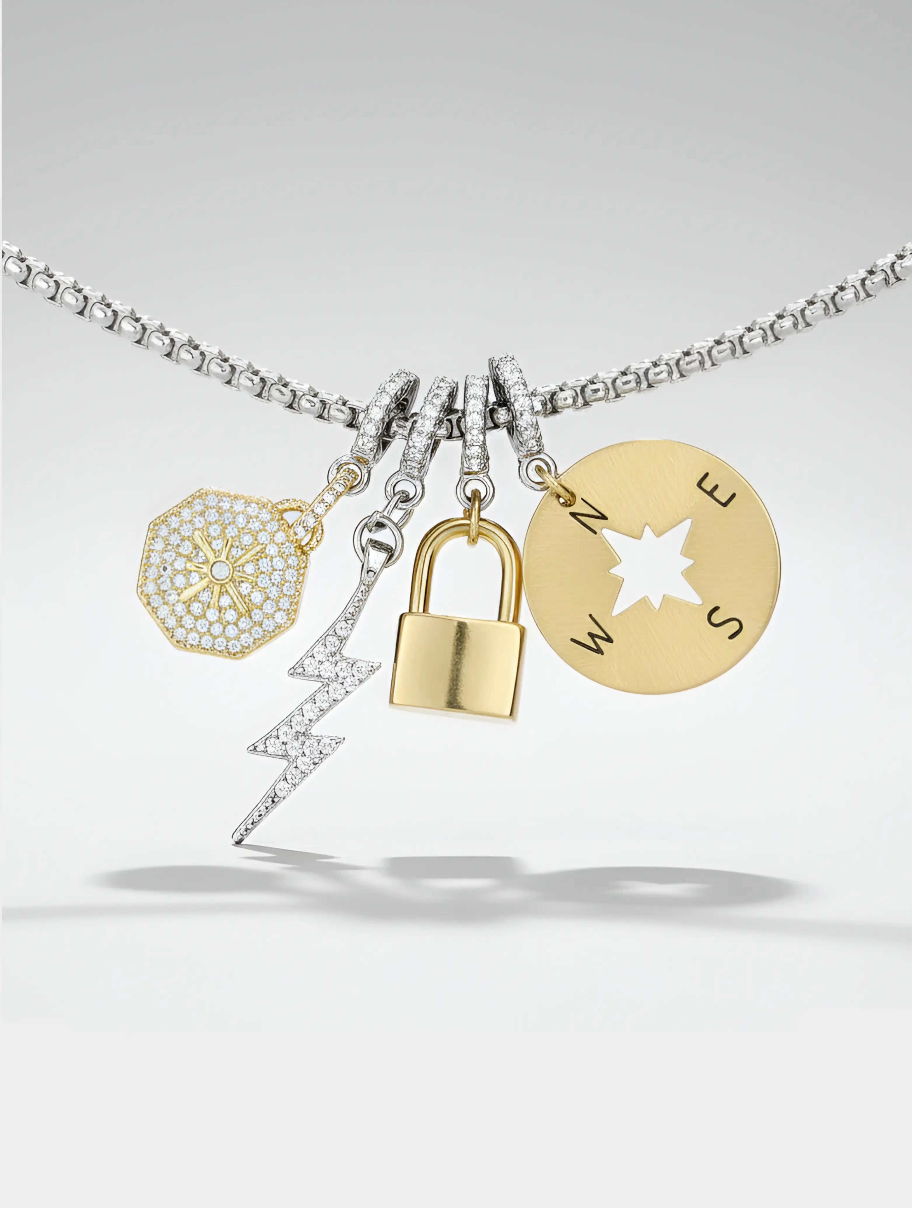 Our charm necklaces are designed to work with a range of styles. You’ll find options like initials and letter necklaces, zodiac, crosses, stars, evil eye motifs, compass charms, emerald details, and modern drop shapes. You can shop necklaces that come styled with charms, or start with a single necklace and add the charms you choose to make it your own.