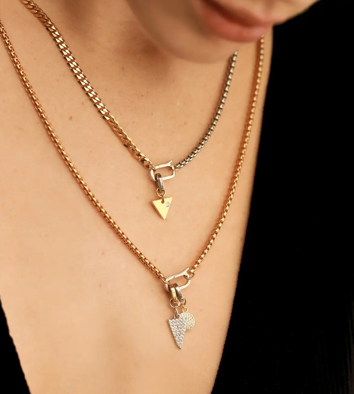 Model wearing two can opener necklaces with the Daga Link Charm, a sparkling silver charm featuring a spike shaped with dazzling array of diamonds, gold dot link and a gold triangle charm with a diamond.