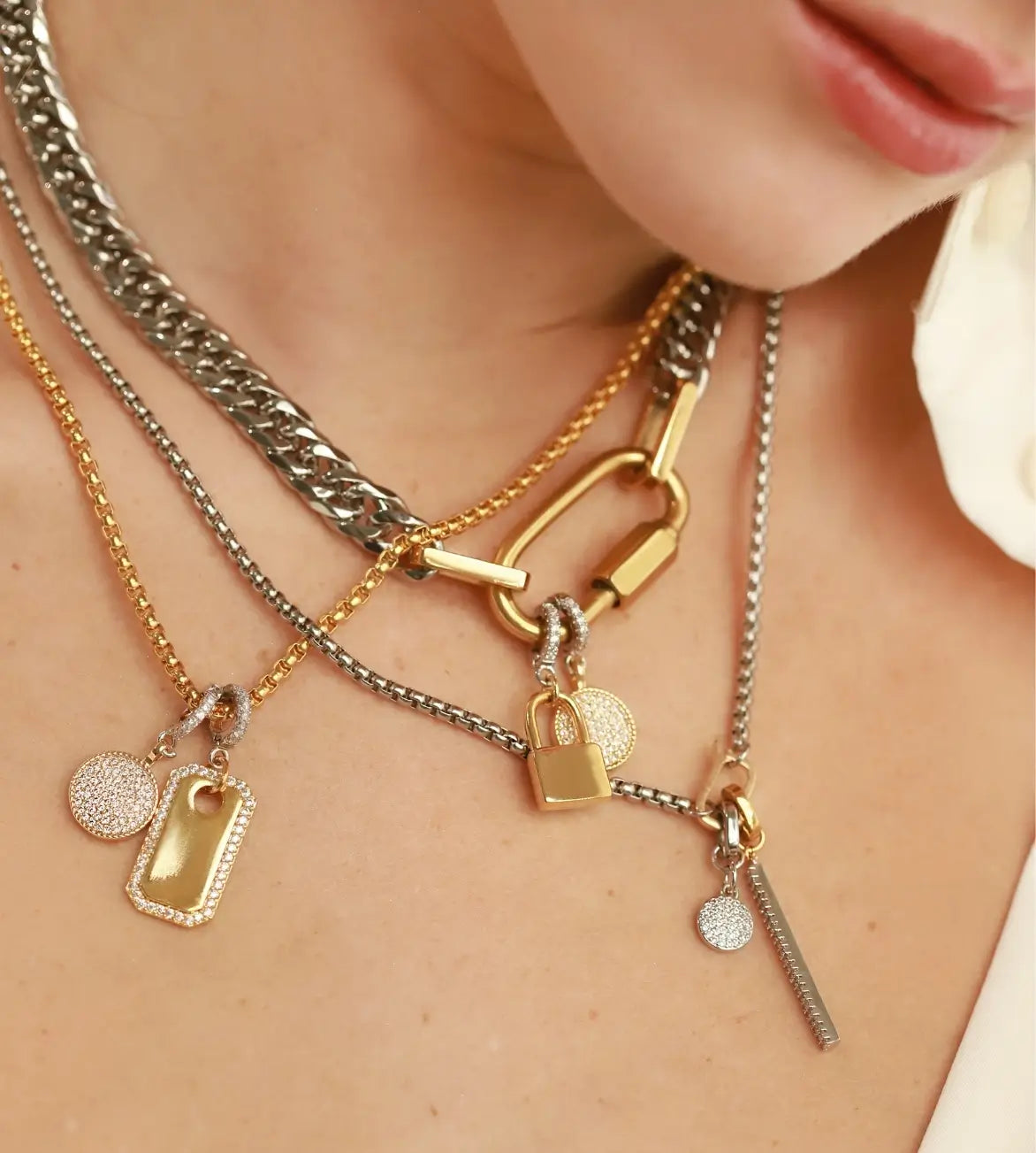 Model wearing layered necklaces with different charms.  One is the Anne Charm Necklace with the  circle and lock clip on charms, gold necklace with the circle and PLAQUE CLIP ON CHARM which is made of Pave Clip on Stainless steel 18k gold plated pave plaque. She is also wearing the can opener box chain with the Dot link and the Bar link charms.