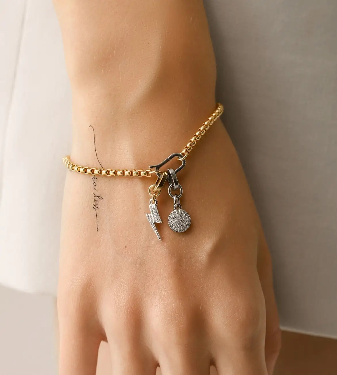 Silver thin chain with the LIGHTNING BOLT CLIP ON CHARM which is made of Pave Clip on Stainless steel 18k gold plated lighting bolt charm.