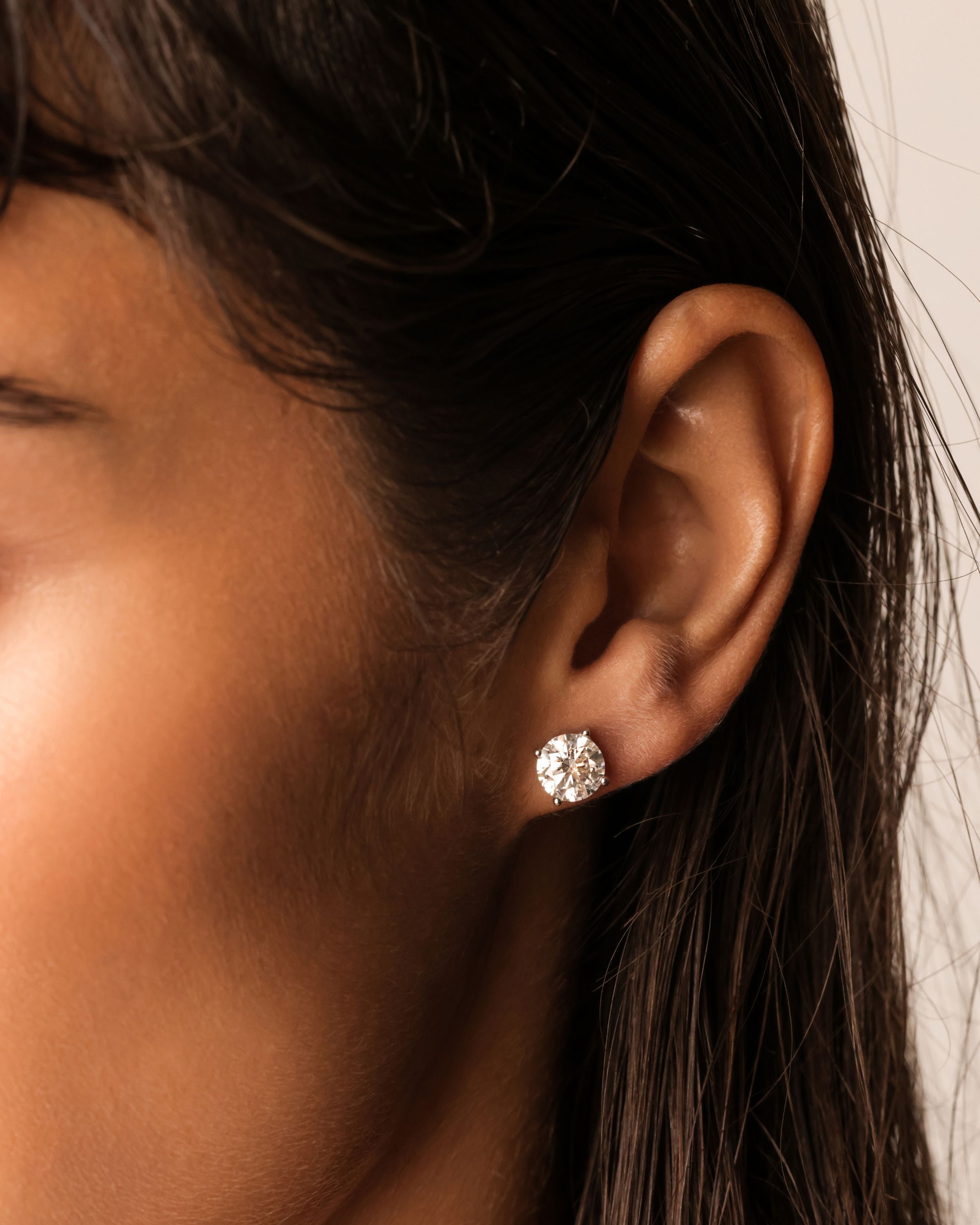 Model wearing one earring from the THIS & THAT Ear set which is a Zirconia diamond Stud surrounded with encrusted zirconia.
