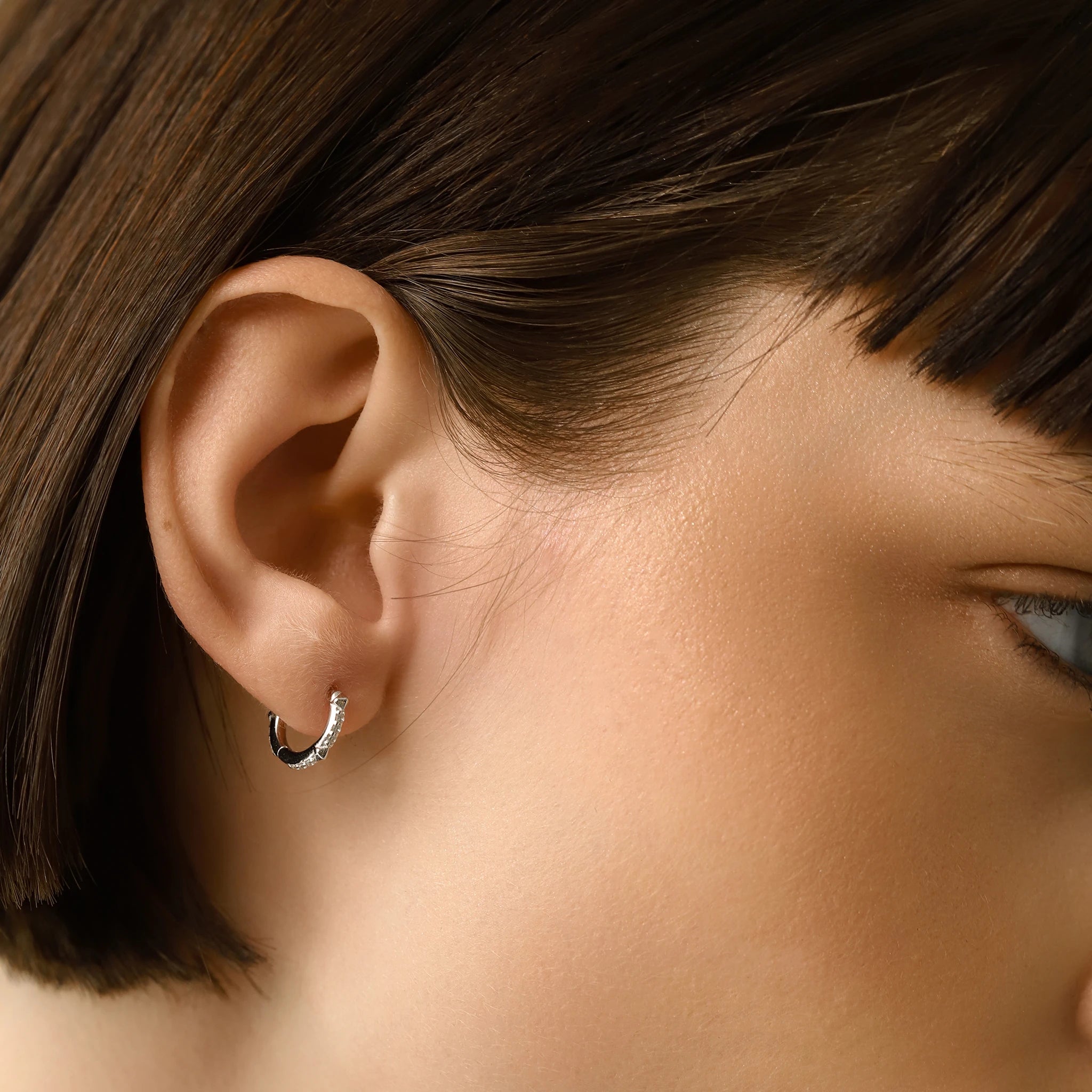 Model wearing the Tiny Huggies Hoop, a pair of small silver hoop earrings that feature a row of sparkling cubic zirconia stones set in a  pointed, triangular pattern.||| SILVER