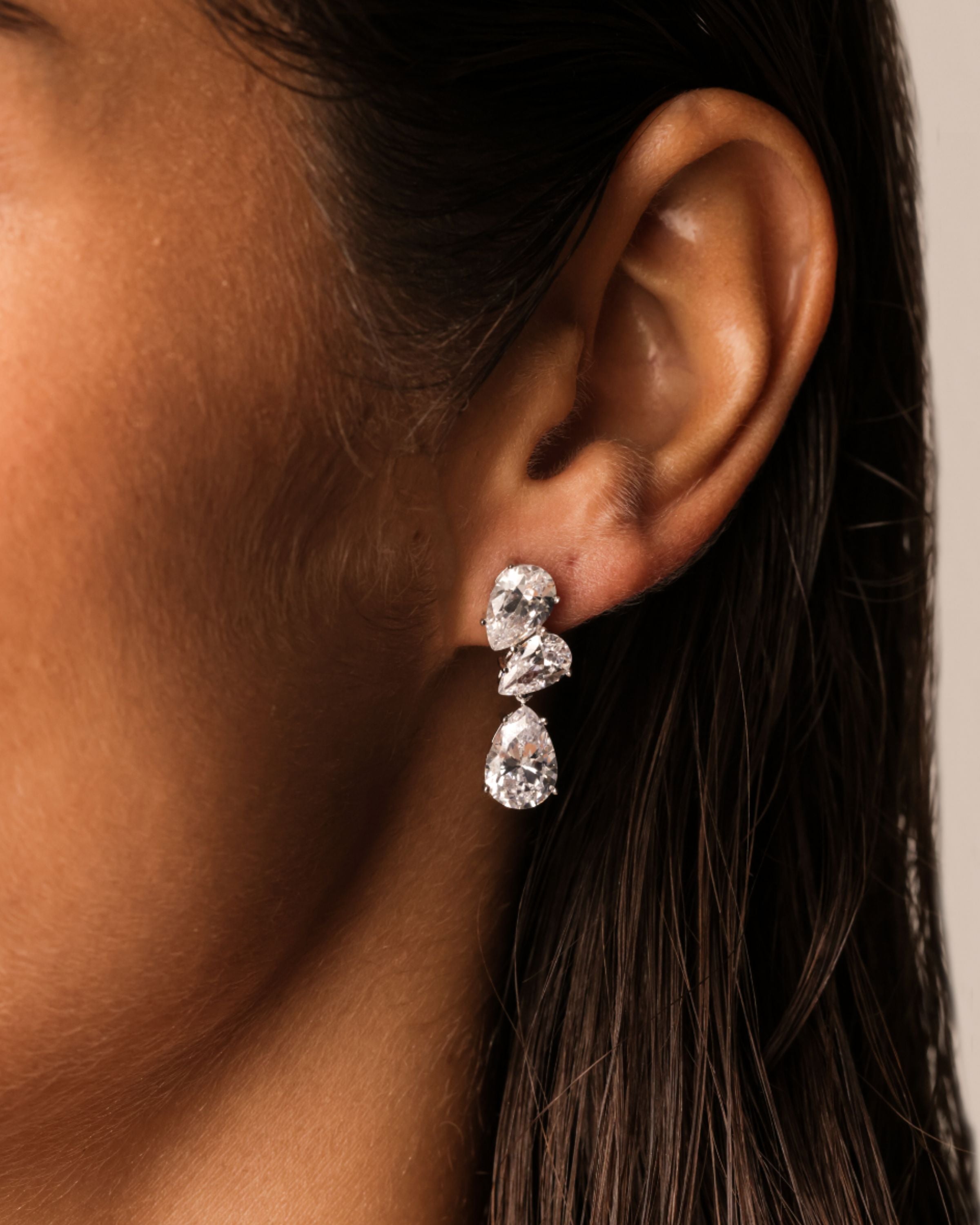 Model's right ear showing the ear party set in silver. it shows her finger positioned closed to her ear wearing the just Ring and a silver ring with a big diamond stone.