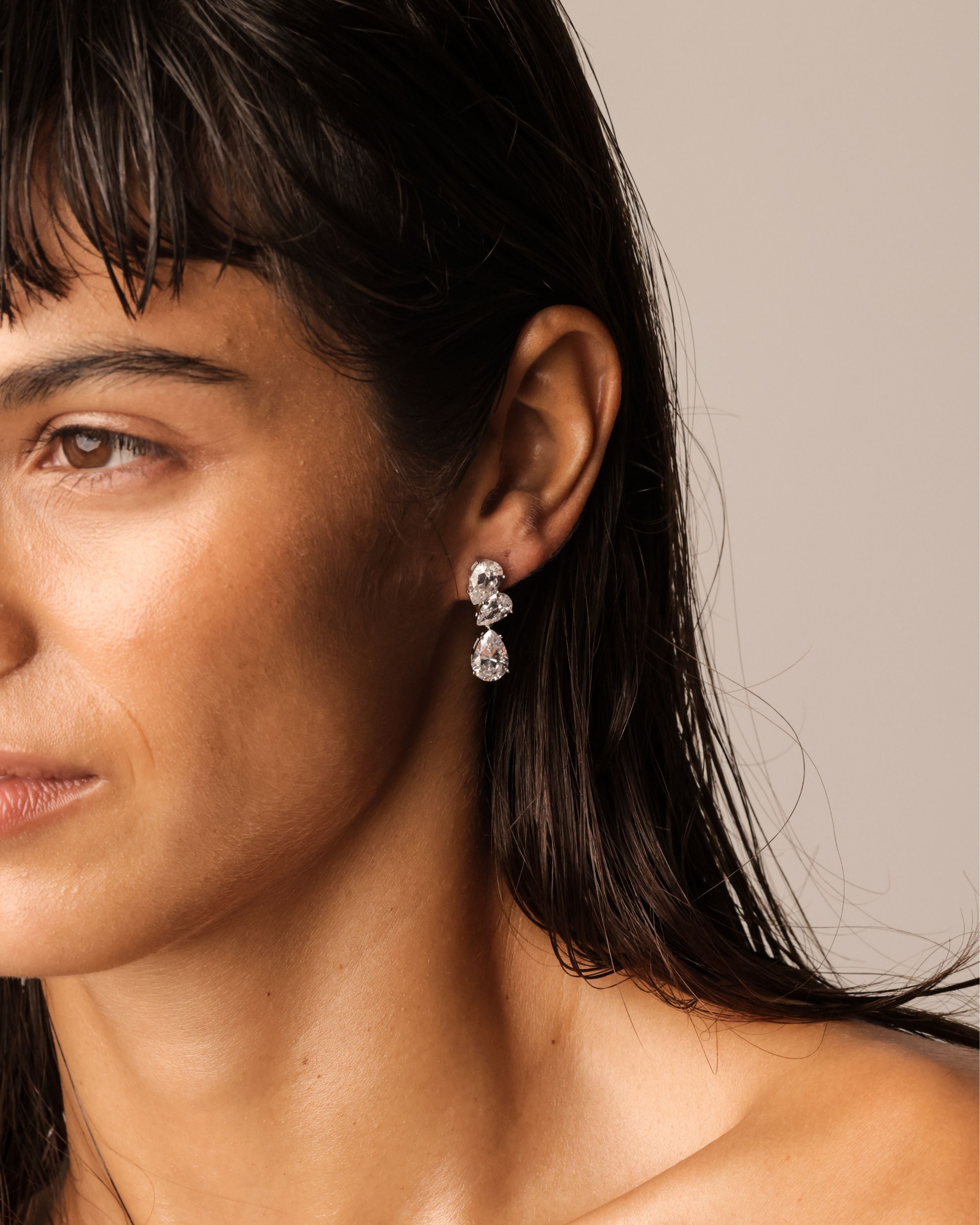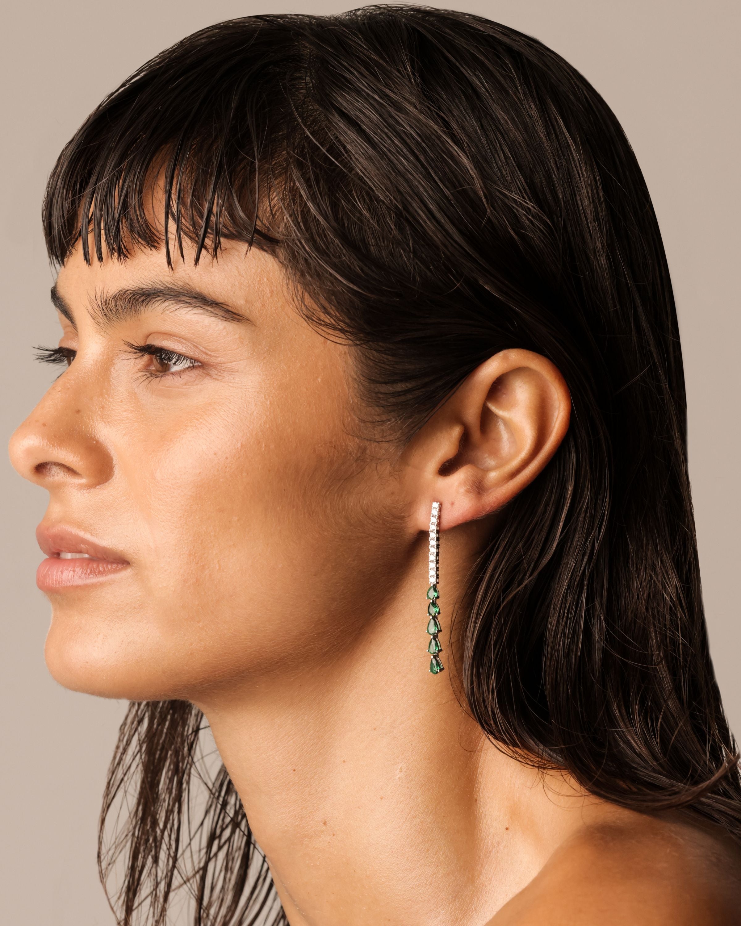 Model is wearing the Positano Earring which is made of a 925 sterling silver and Cubic zirconia. The climber earring is made of 7 leaf-shaped cubic zirconia stones.