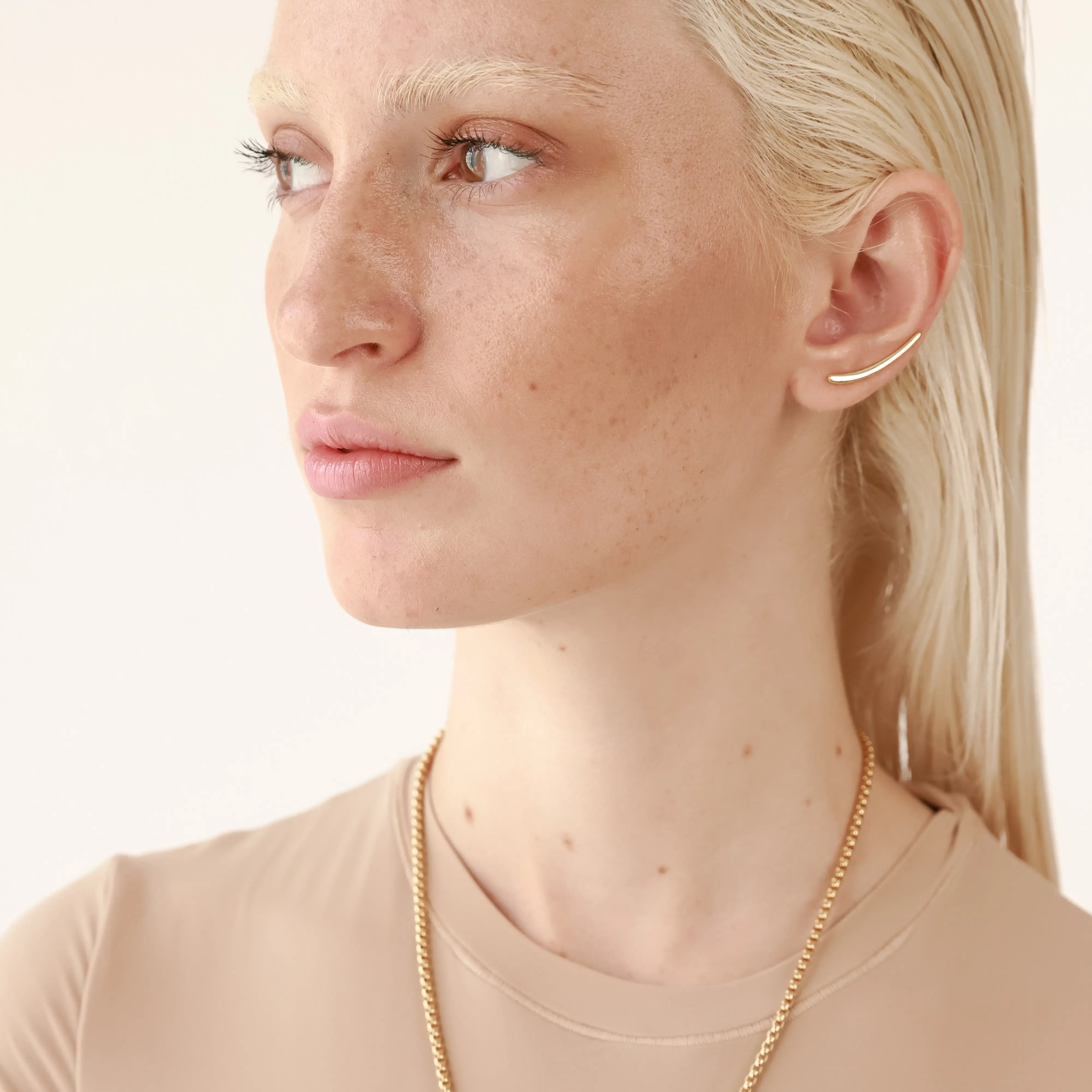 The Line Climber, which is a single-piece gold ear climber earring, features a minimalist curved bar that elegantly follows the contour of the ear for a contemporary and sophisticated look, perfect for adding understated elegance.