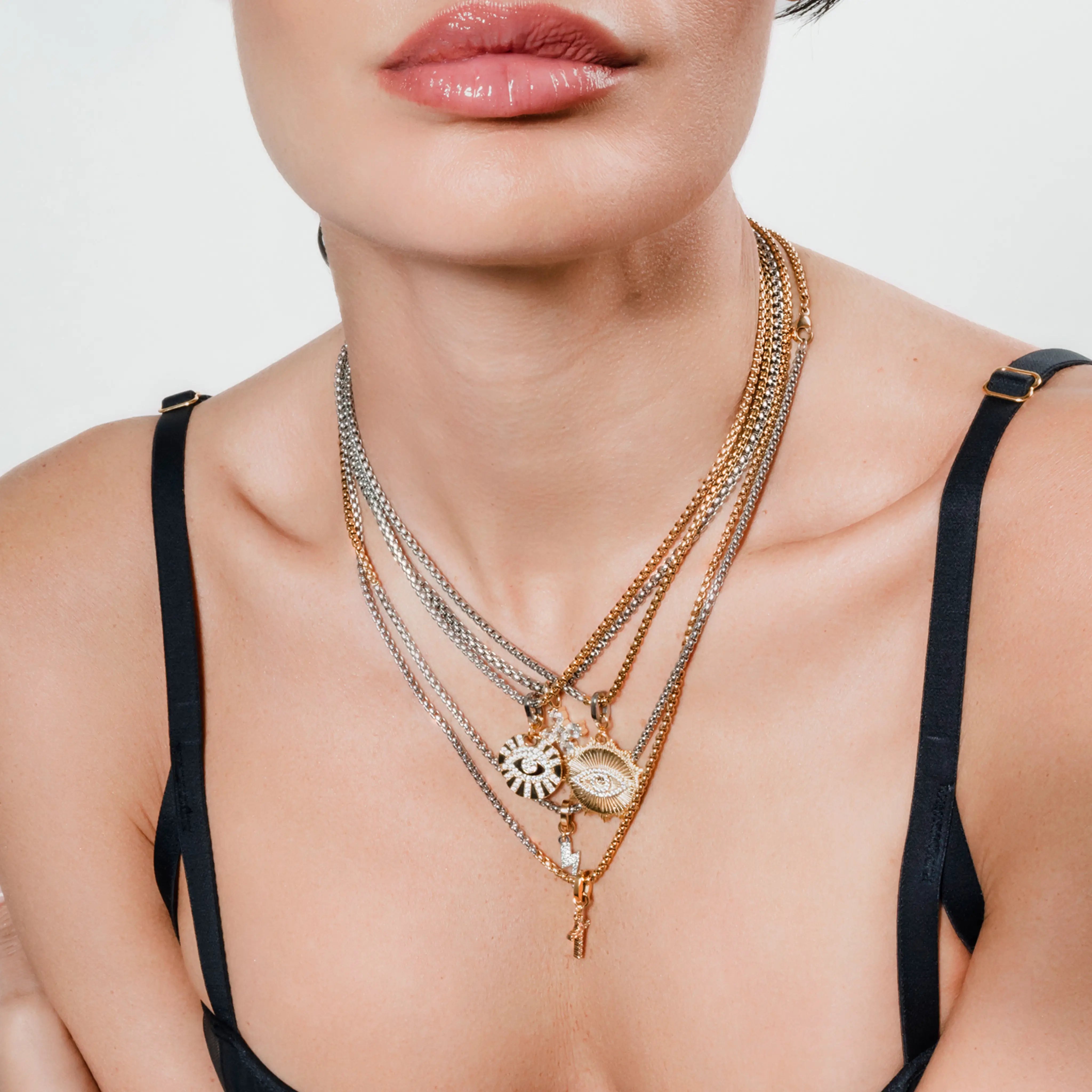 Model wearing three layered necklaces made of stainless steel with individual charms like the EVIL EYE 2 BOLT CLIP ON CHARM which is made of Pave Clip on Stainless steel 18k gold plated Zirconia Evil Eye, the Celestial Star Clip on Charm and the Drop Star Clip on Charm.