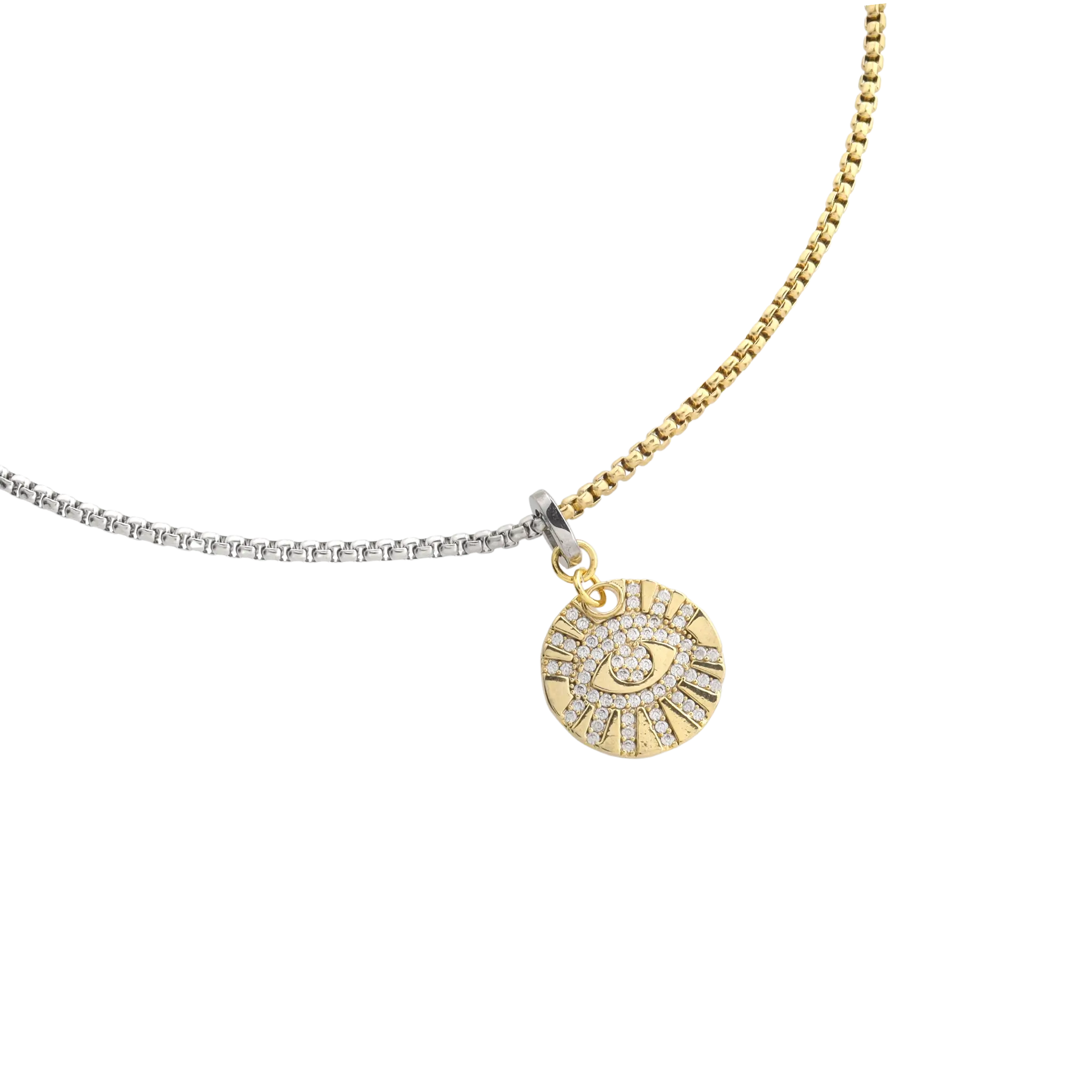 The Herradura Eye Layered Necklace, a bold two-tone necklace featuring dual silver and gold chains with an eye-catching evil eye charm and a sunburst pendant. This statement piece combines chunky layered chains with mystical-inspired charms, perfect for adding an edgy and unique look to any outfit.