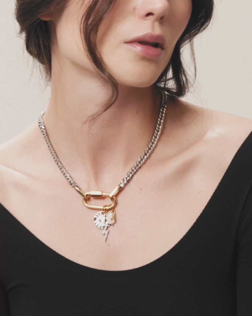 Model wearing two layered necklaces. The CAN OPENER CUBAN CHAIN with the DOT LINK CHARM and the LIGHTING BOLT LINK CHARM and the Herradura Mix Necklace in silver chain and gold herradura clasp with the EVIL EYE 2 BOLT CLIP ON CHARM which is made of Pave Clip on Stainless steel 18k gold plated Zirconia Evil Eye and also the Solitaire Clip on Charm.