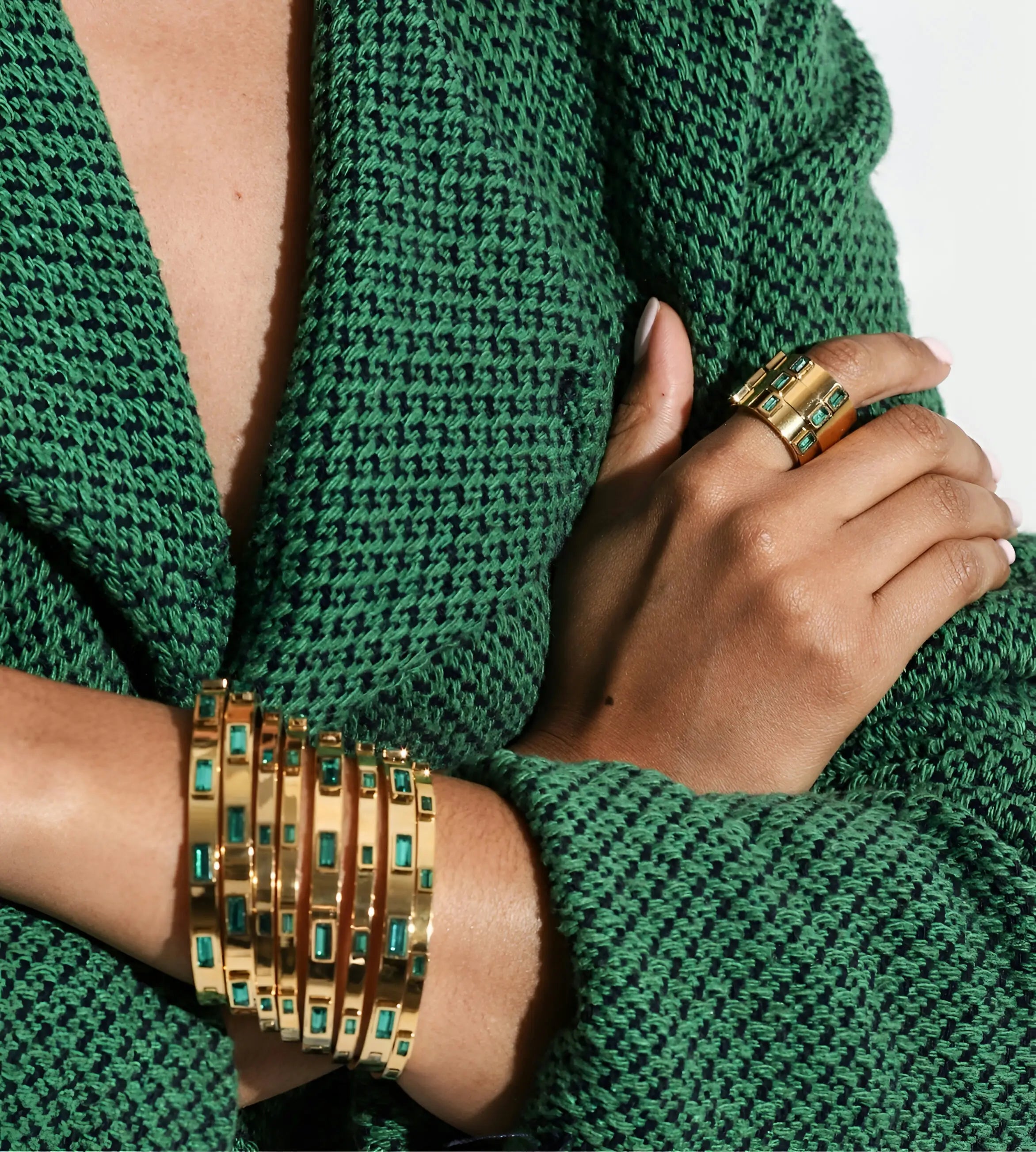 Model wearing the Nekhamma Stack, a three-piece gold and silver bracelet stack featuring a bangle with the word "ARTIZAN," a bangle with textured detailing, and a chain bracelet with a spike-shaped accent.