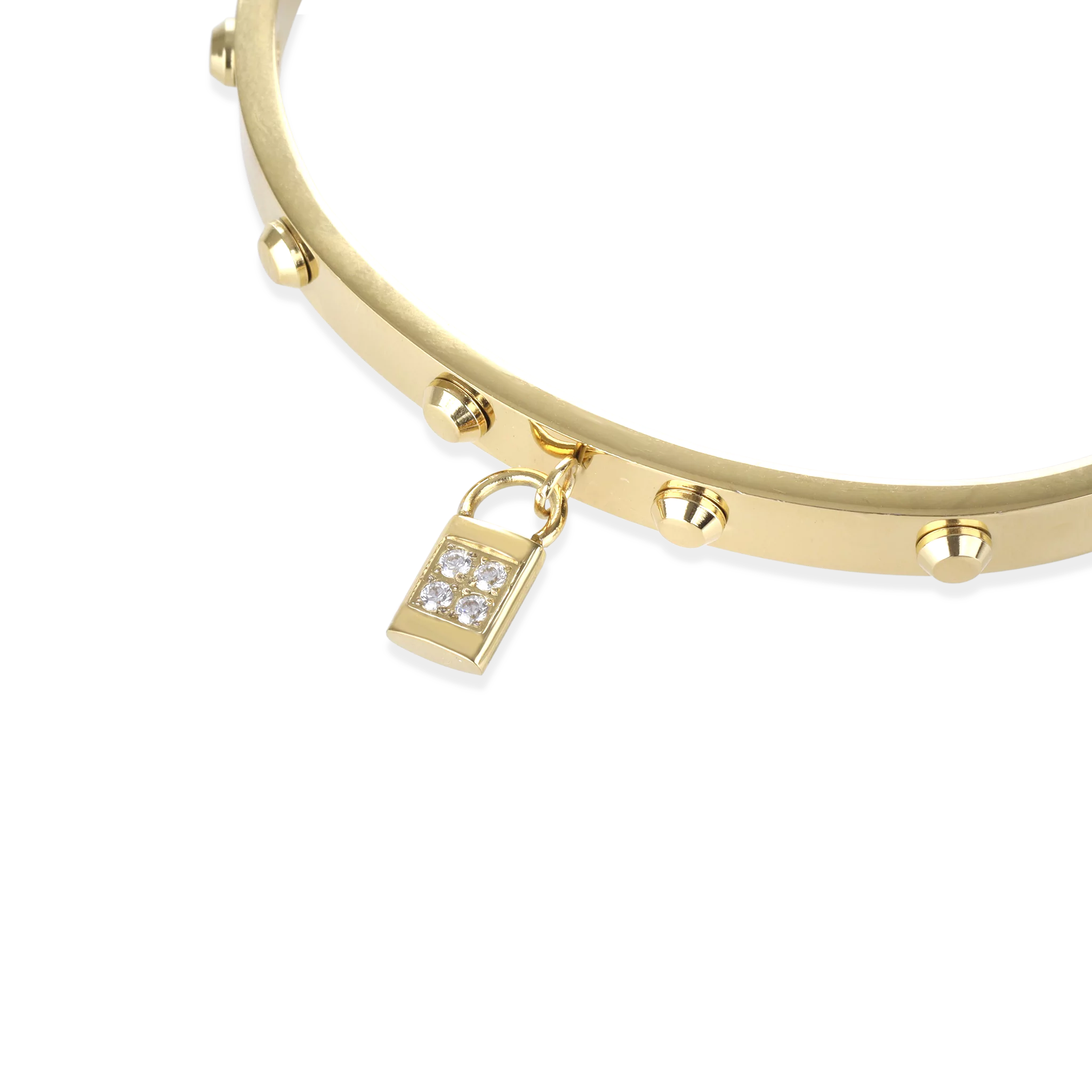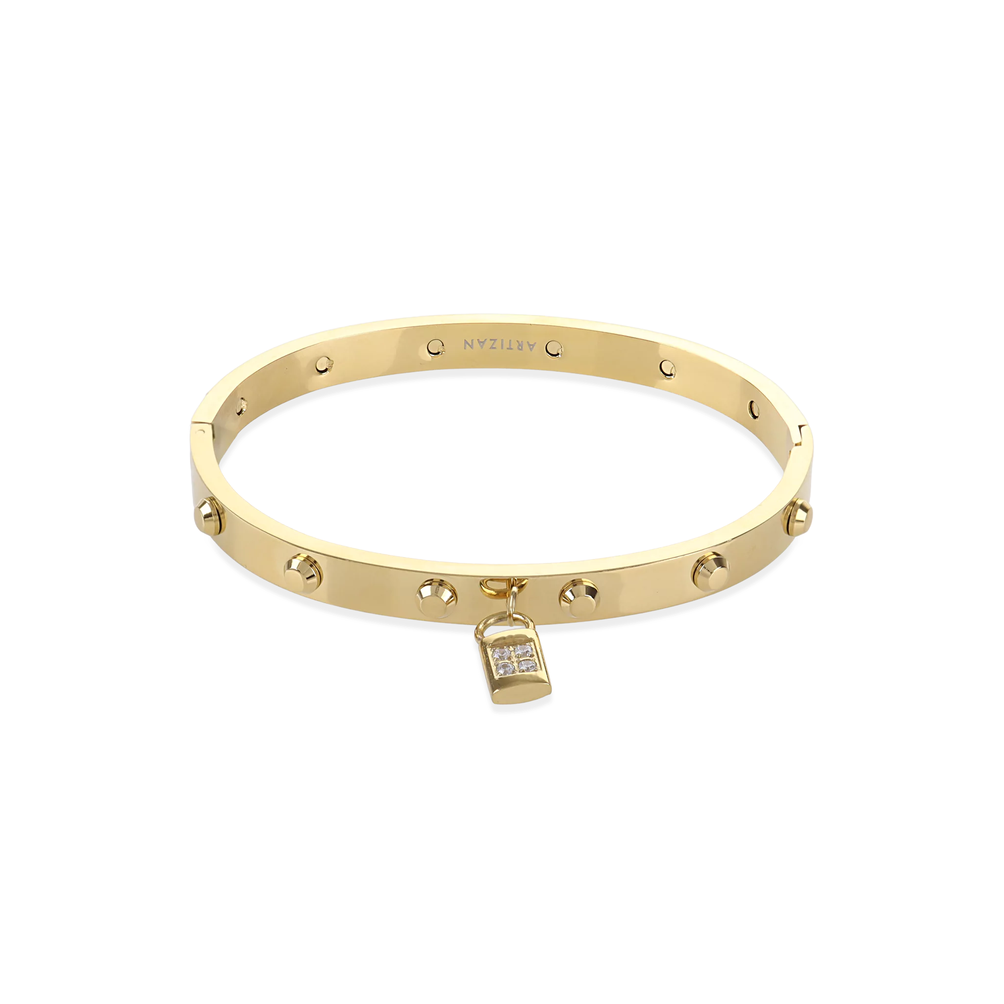 The Lock Bangle, which is a single gold bangle, features a studded design and a sparkling lock charm detail. This elegant piece in gold adds a secure, stylish touch with its distinct lock motif and subtle shimmer, perfect for making a bold statement on its own.