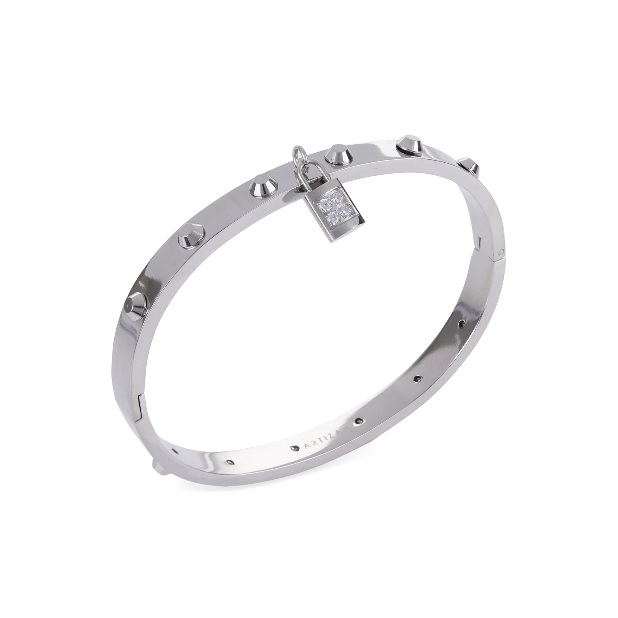 The Lock Bangle, which is a single silver bangle, features a studded design with a sparkling lock charm. This sleek piece in silver adds a refined, edgy touch with its distinctive lock detail, making it a versatile statement accessory on its own.