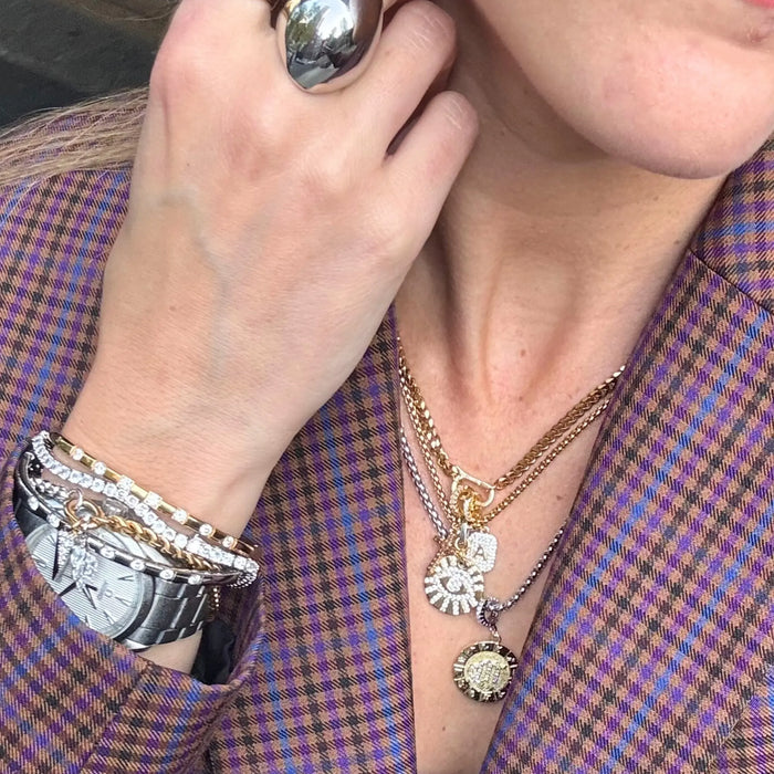 Our mixed metal pieces are crafted to last, but proper care helps maintain shine and prevent tarnish. Avoid excessive water and chemical exposure for the best results.