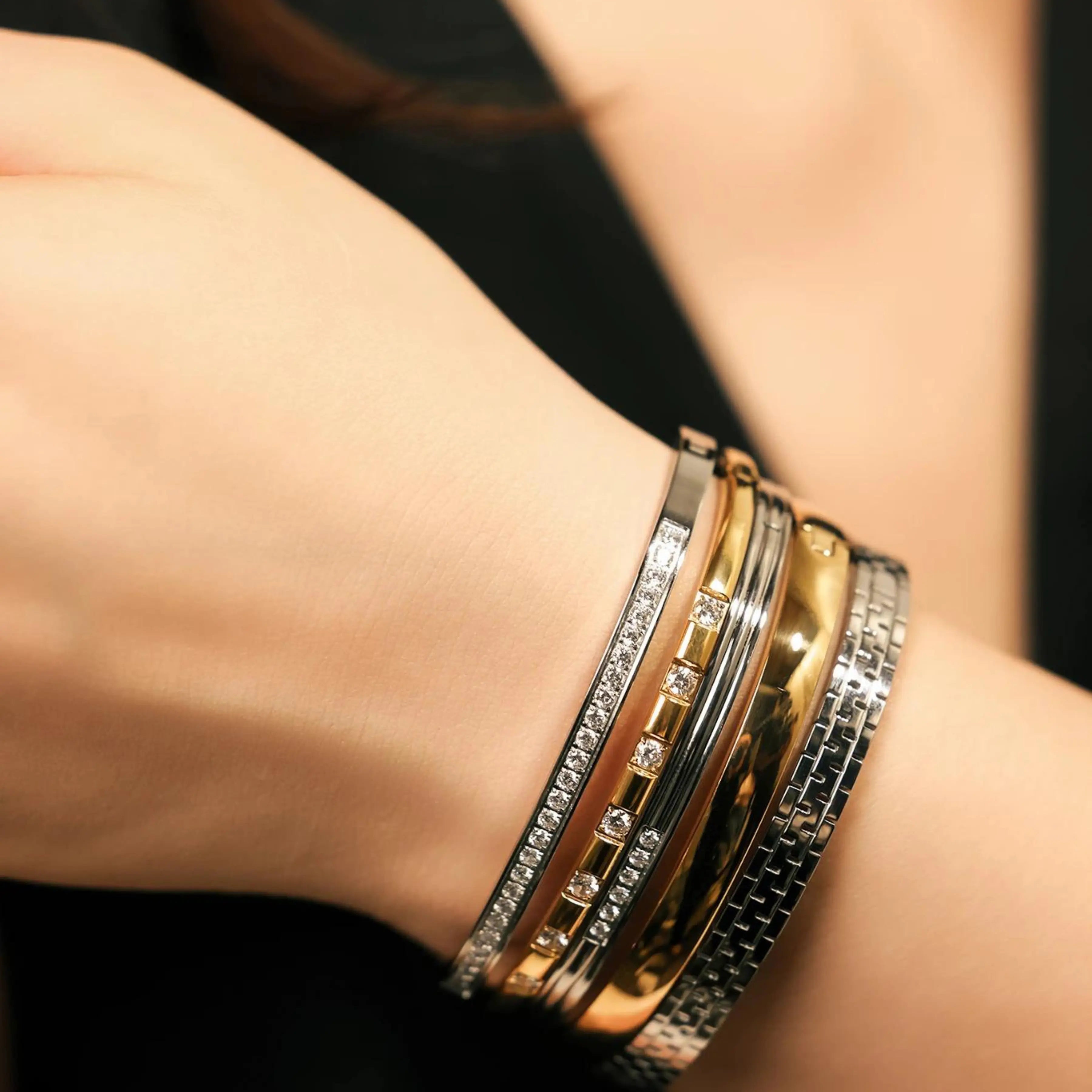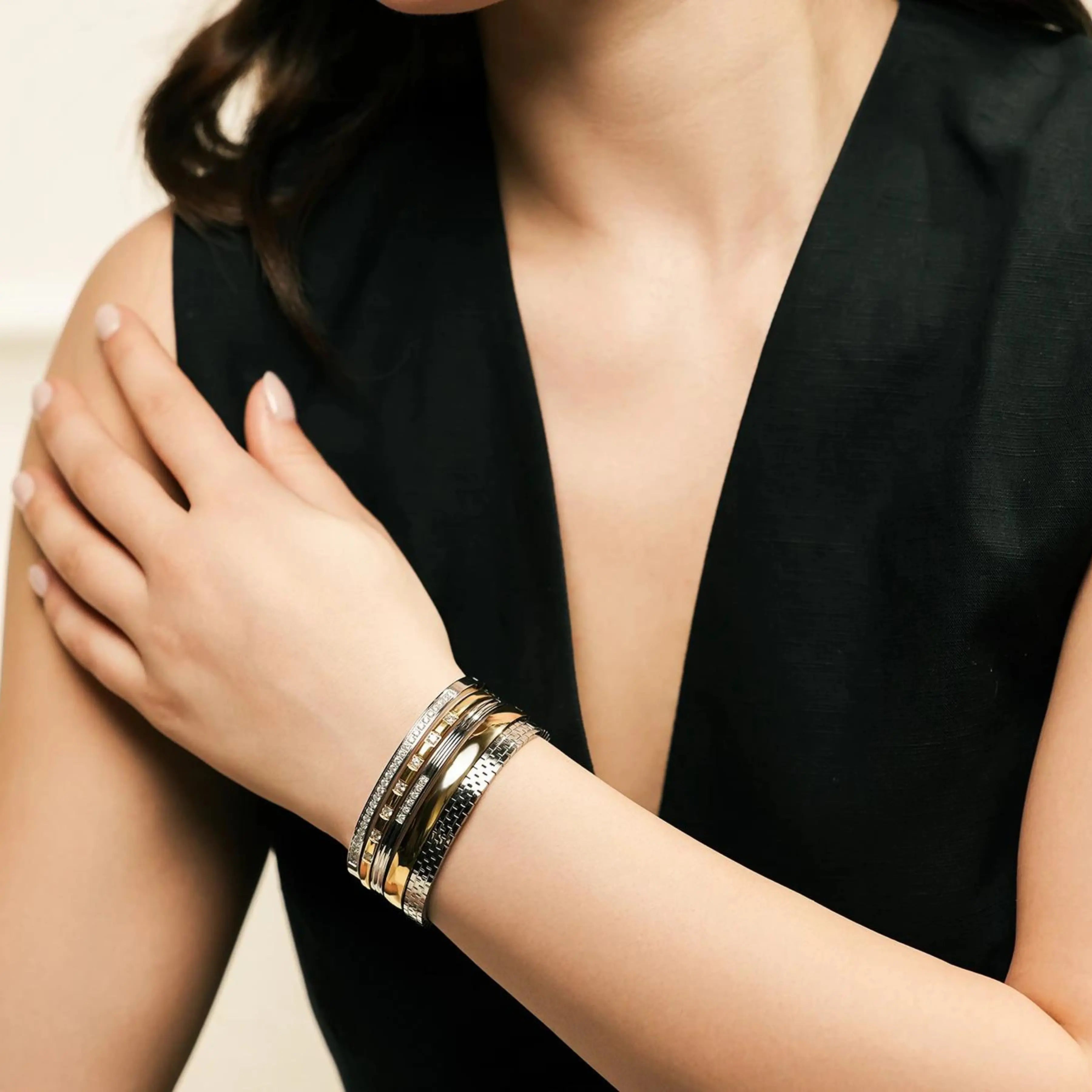 Model wearing the Intense Stack, a five-piece gold and silver bracelet stack featuring bangles with various diamond-like accents and textured designs.