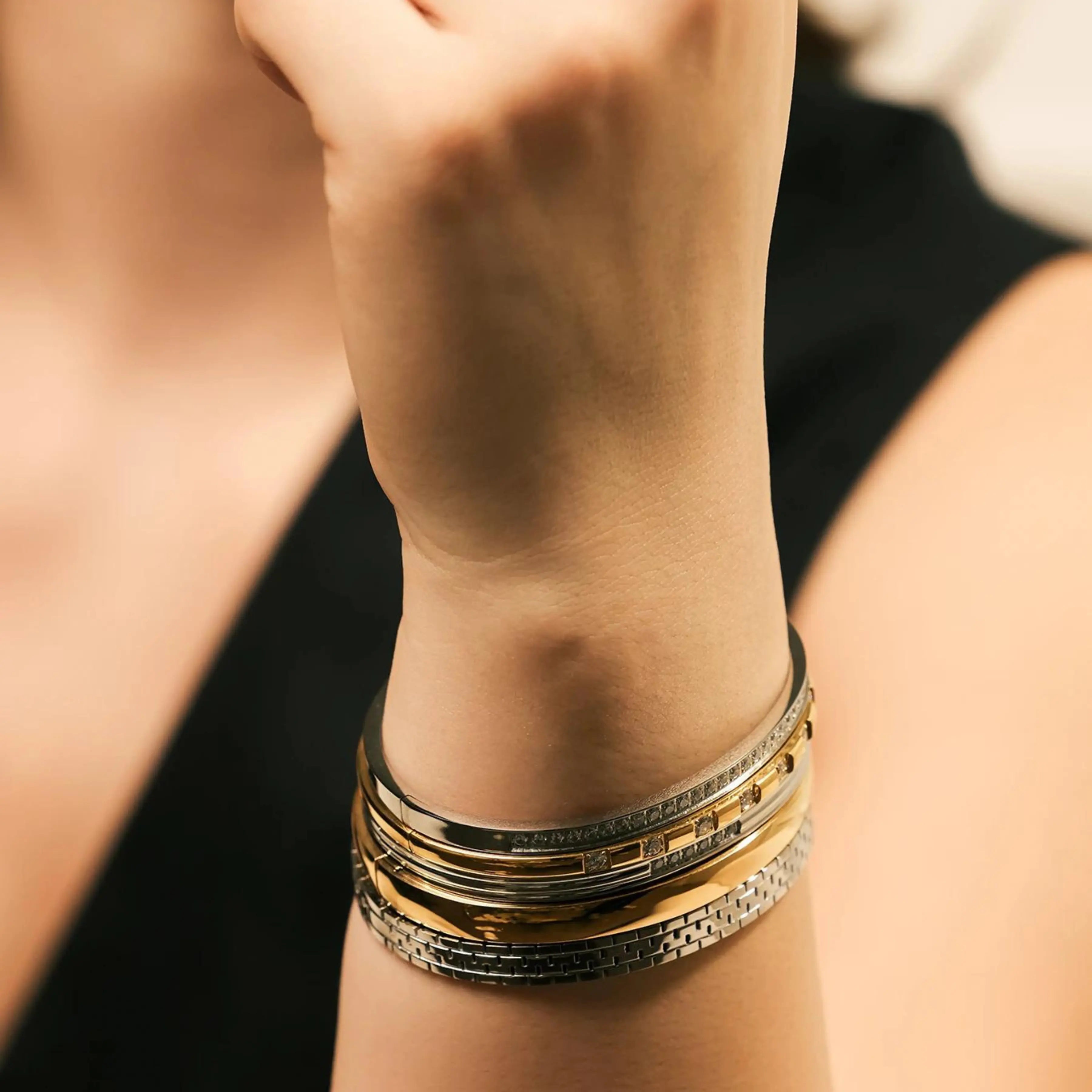 The Dynamic Stack, a five-piece bracelet stack featuring a mix of gold and silver bangles, a gold chain bracelet, and a silver cable wire bracelet. Some bangles are accented with cubic zirconia stones.