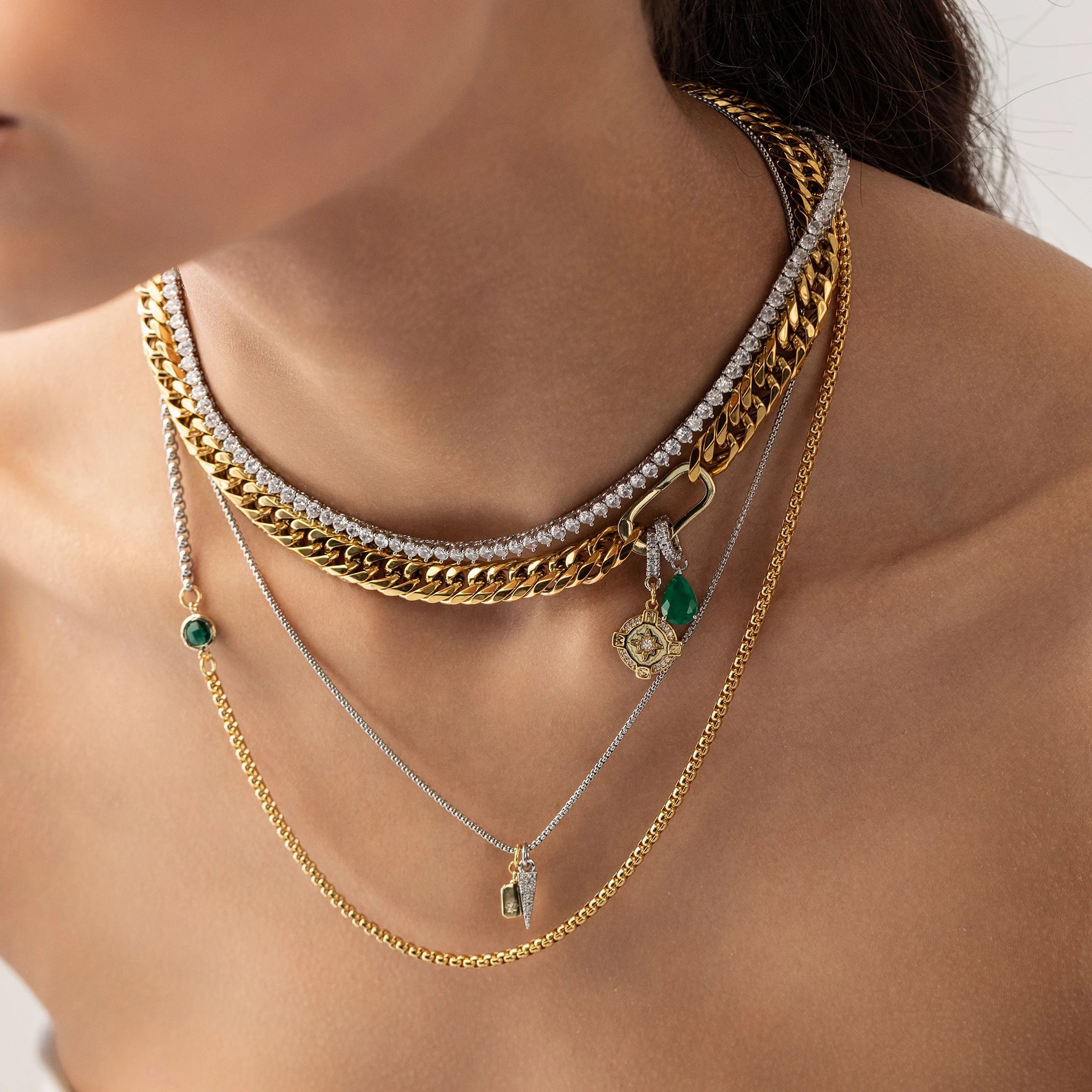 The Just Click Emerald Tennis Necklace Set, a four-piece gold and silver necklace set featuring a variety of chains with diamond-like accents, emerald accents, and a variety of charms.
