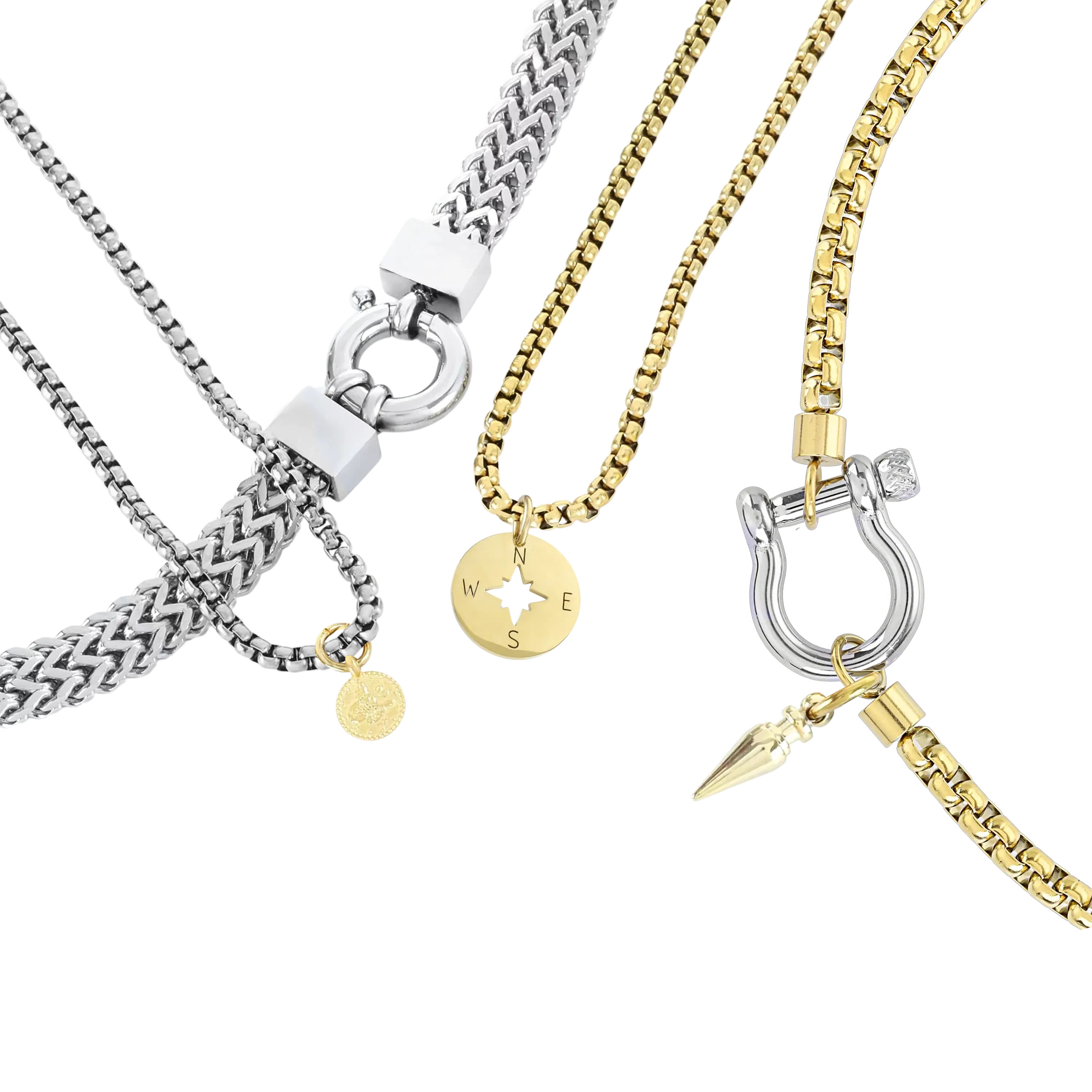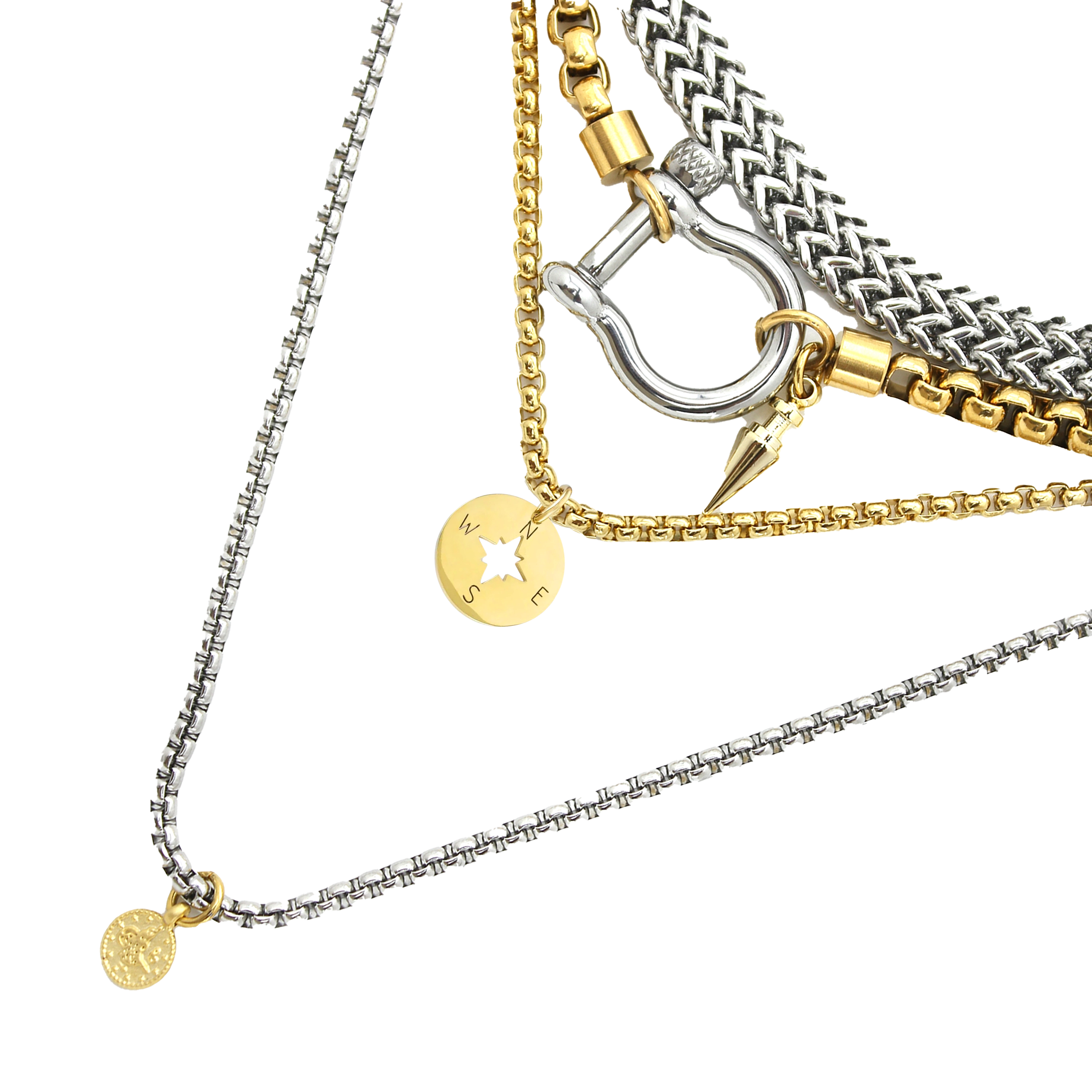 The HERRADURA LAYERED NECKLACE SET in silver variant which includes 4 separate chains. It includes the Marinero silver chain, 18k gold plated stainless steel chain with an silver horseshoe clasp and gold plated spike pendant. The other two necklaces are the gold plated chain with the gold compass disc and silver chain with gold ottoman disc pendants. |||Silver