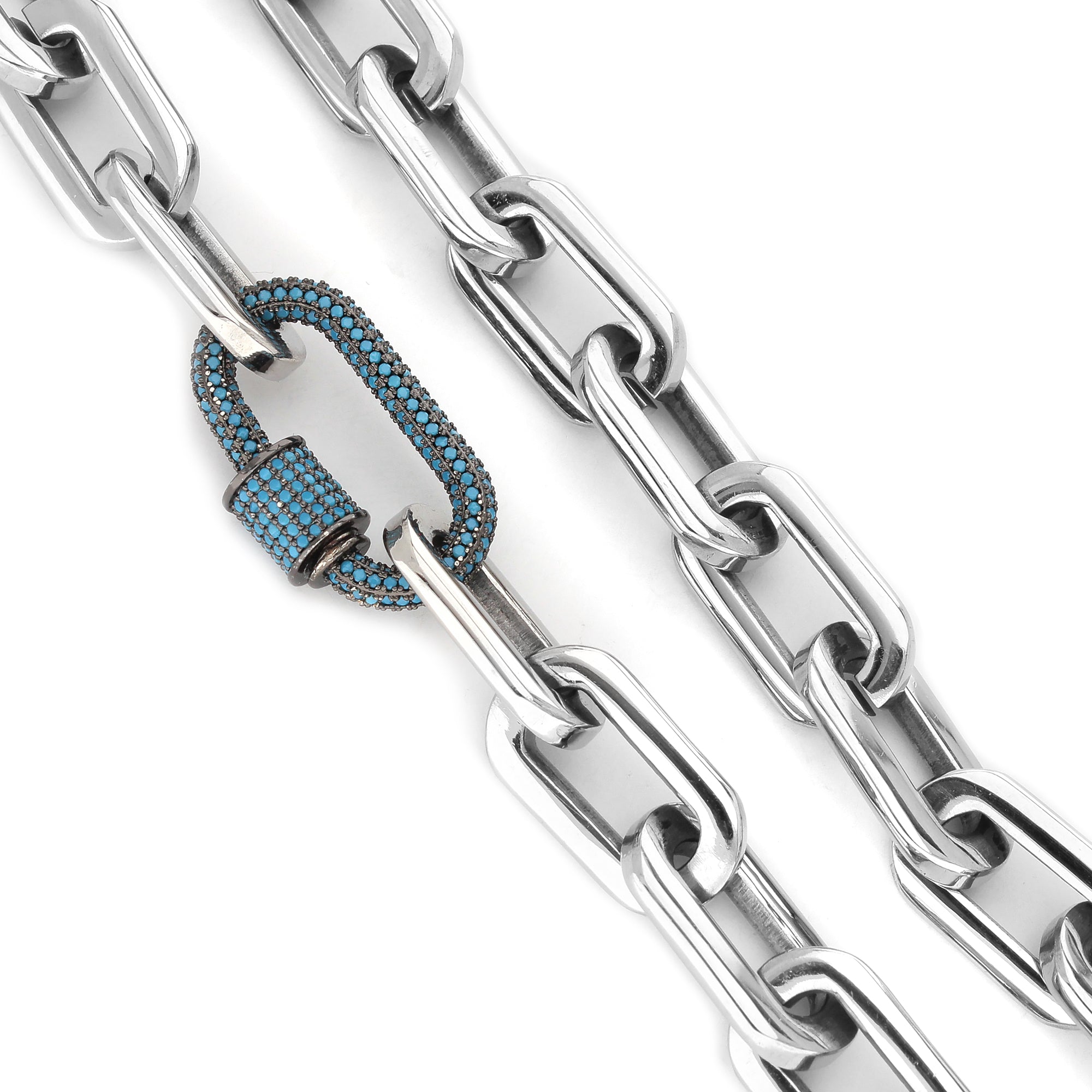 The SAN MARINO PUERTO NECKLACE, which is a single statement necklace crafted from silver-tone chain links with a striking blue pavé-accented clasp for added elegance. This bold and modern piece is perfect for elevating any outfit.