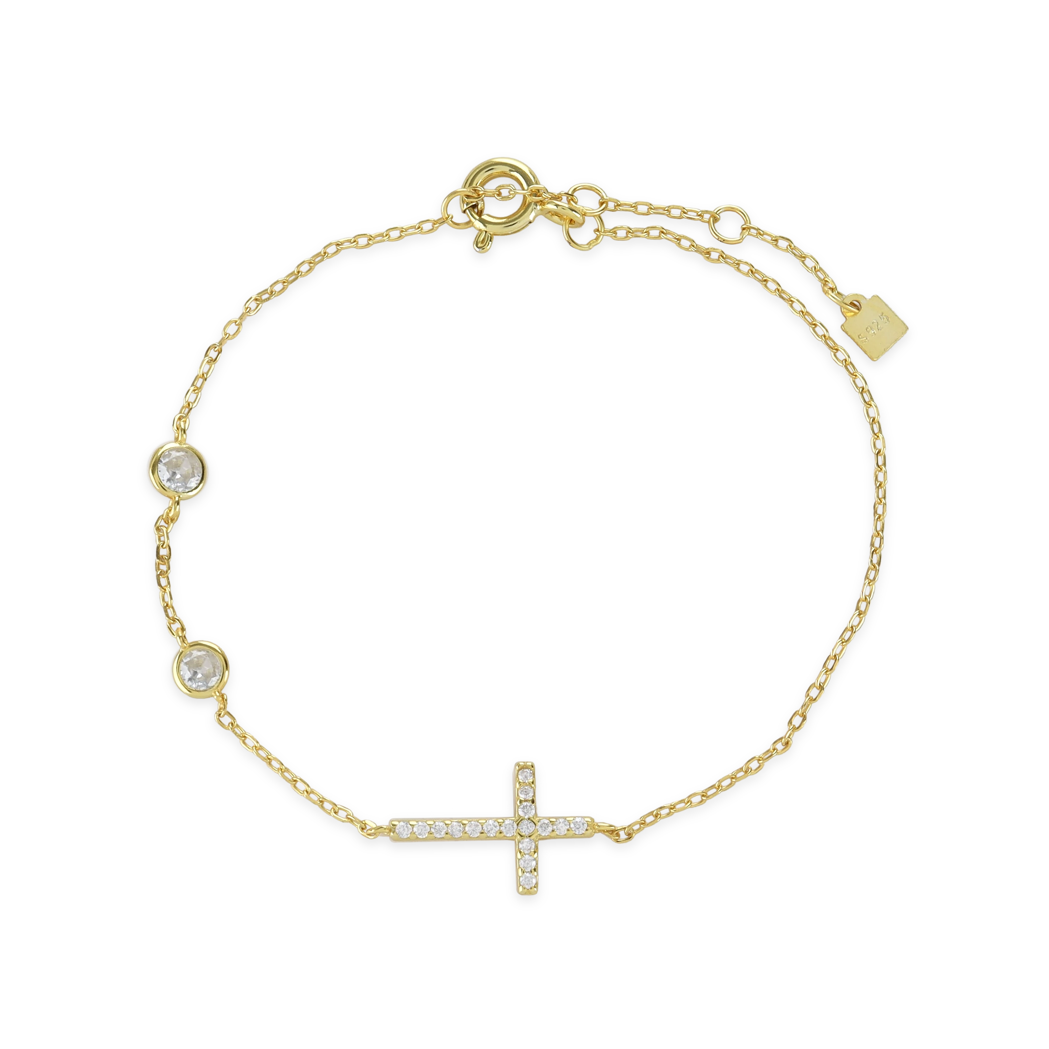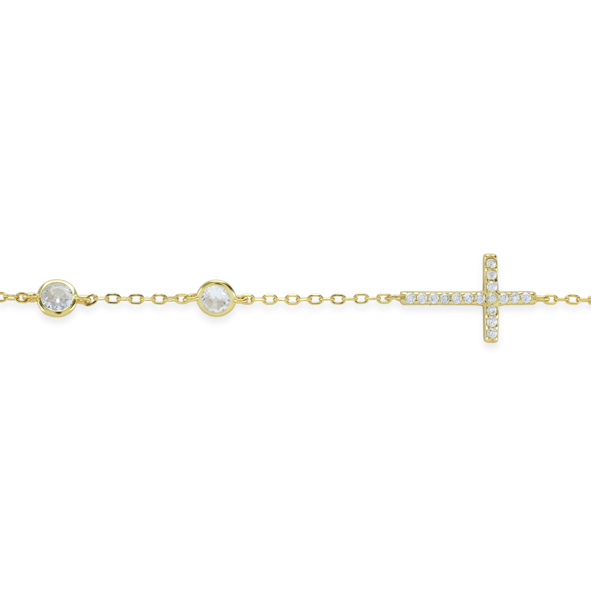 The Fine Cross Bracelet which is a gold bracelet featuring a dainty chain adorned with three shimmering diamonds and a cross charm set with sparkling diamonds. ||| SILVER