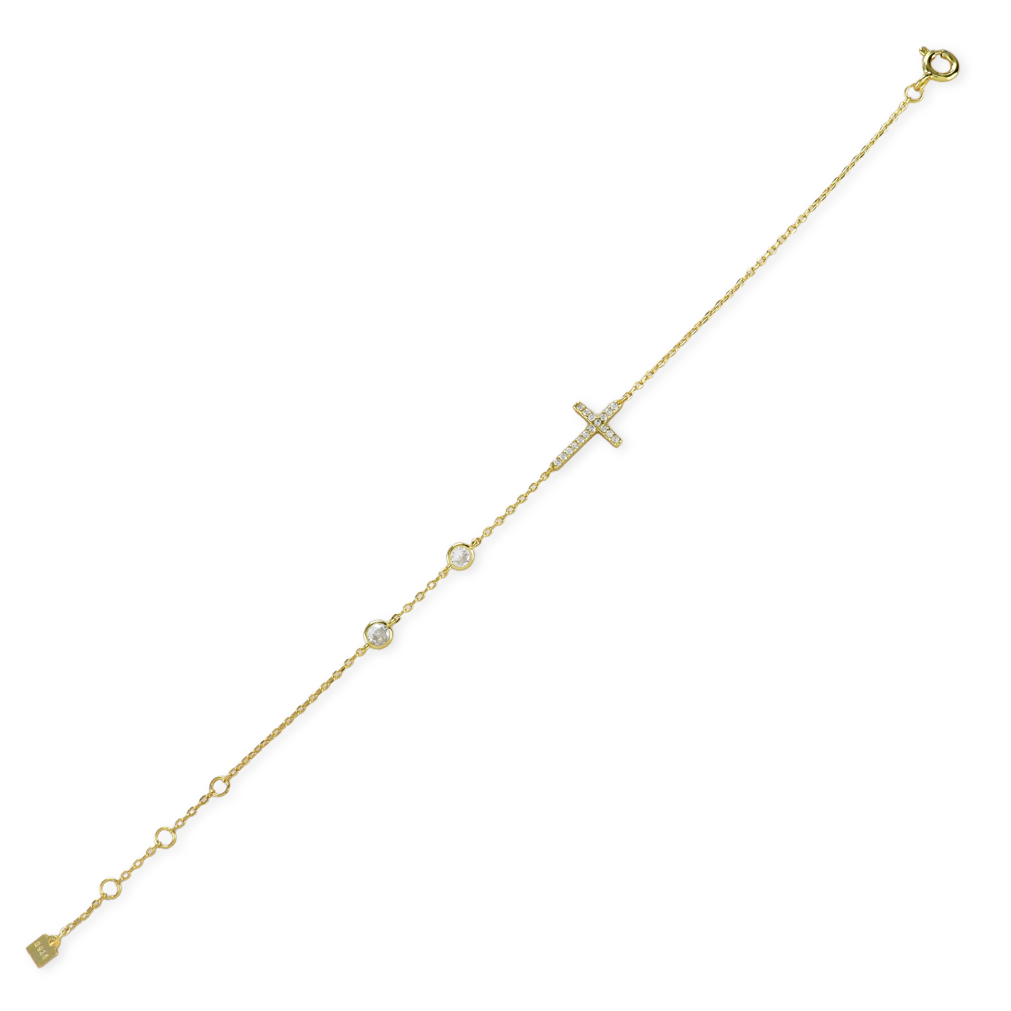 The Fine Cross Bracelet which is a gold bracelet featuring a dainty chain adorned with three shimmering diamonds and a cross charm set with sparkling diamonds. ||| GOLD