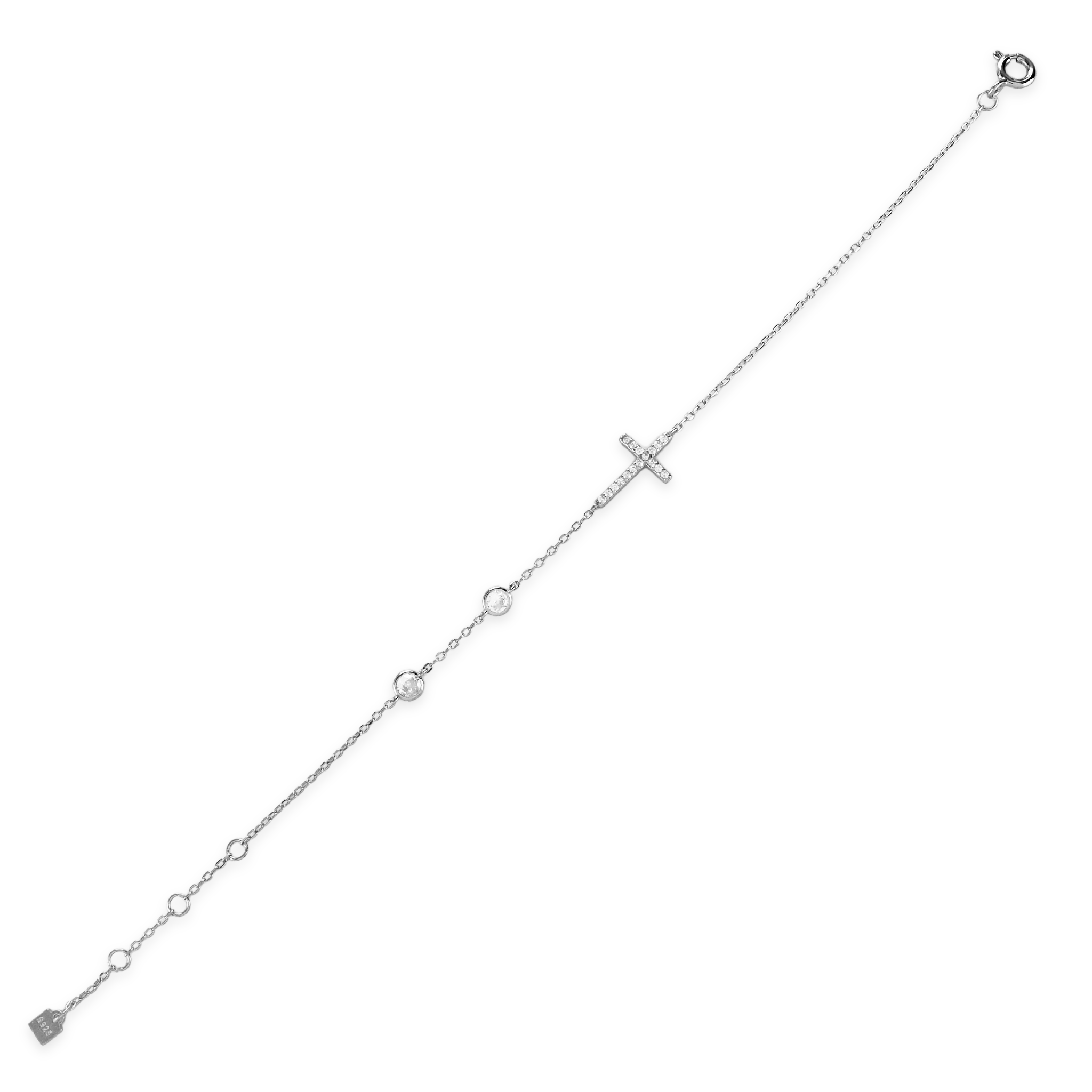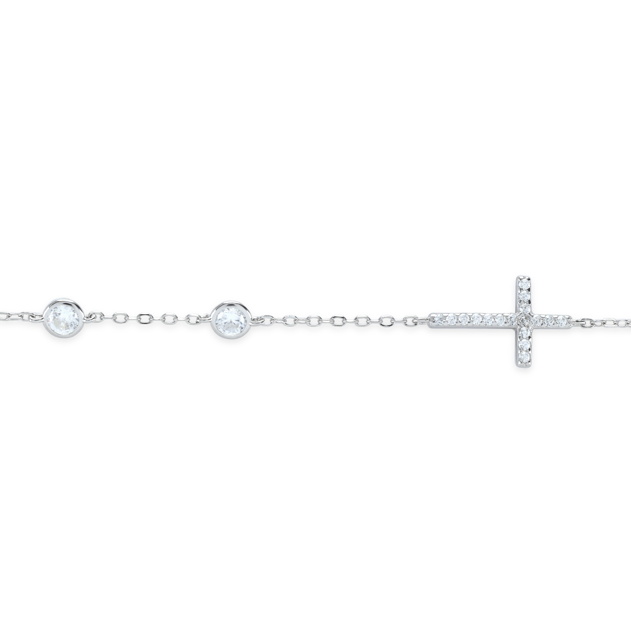 The Fine Cross Bracelet, a delicate silver chain bracelet featuring a horizontal pavé crystal cross and bezel-set crystals along the chain. This elegant and minimalist piece adds a subtle sparkle and a touch of faith-inspired style, perfect for layering or wearing alone for a refined look ||| SILVER