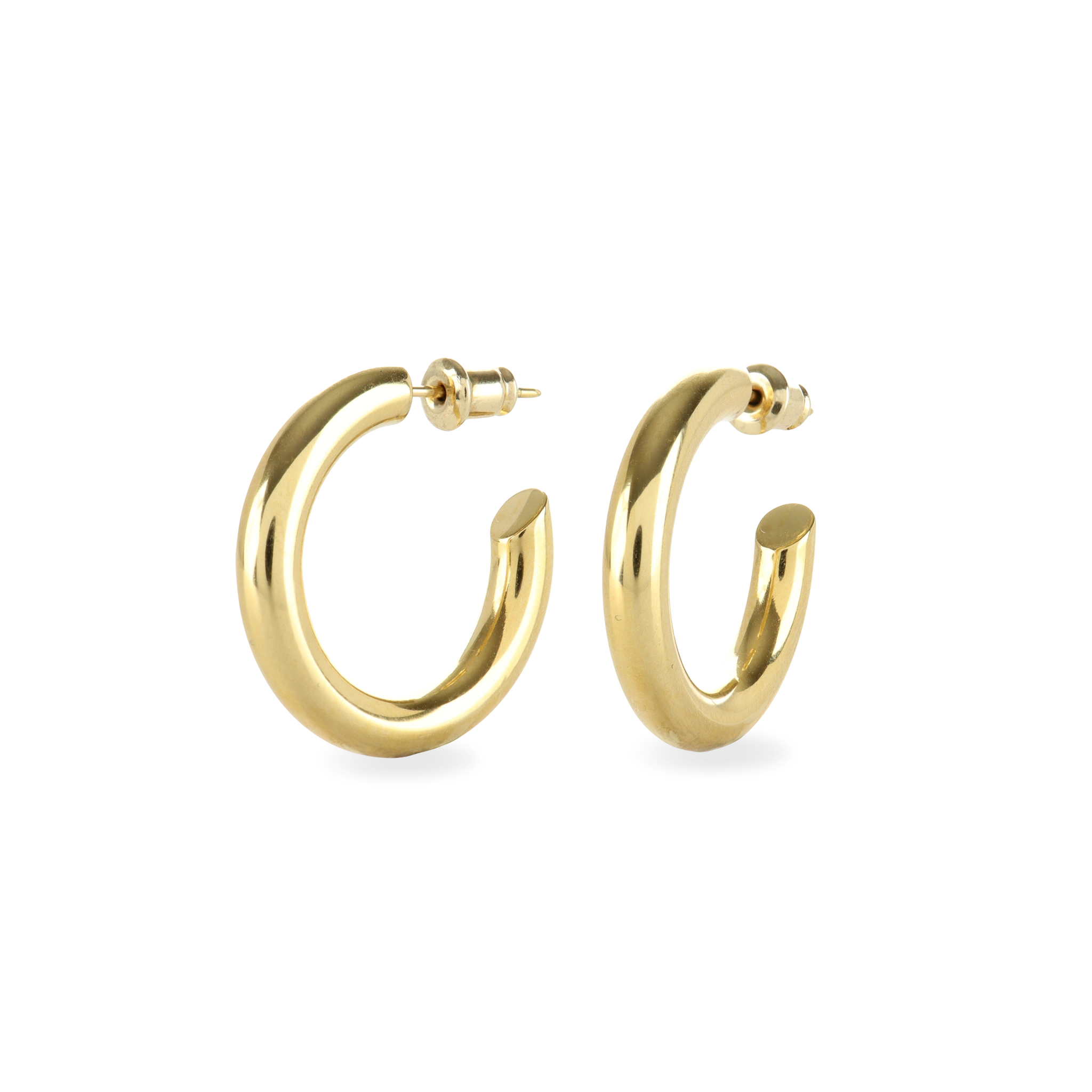 The One Stone Gold Piercing Hoops, which are gold hoop earrings, feature a central heart-shaped stone with additional sparkling accents along the band.