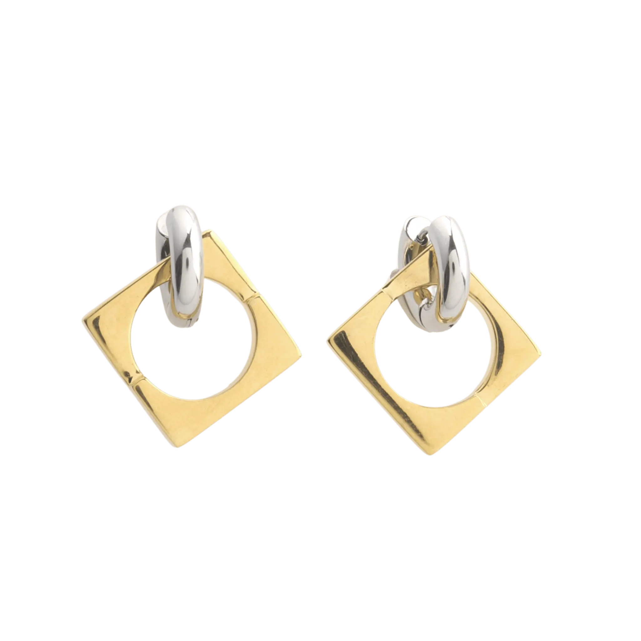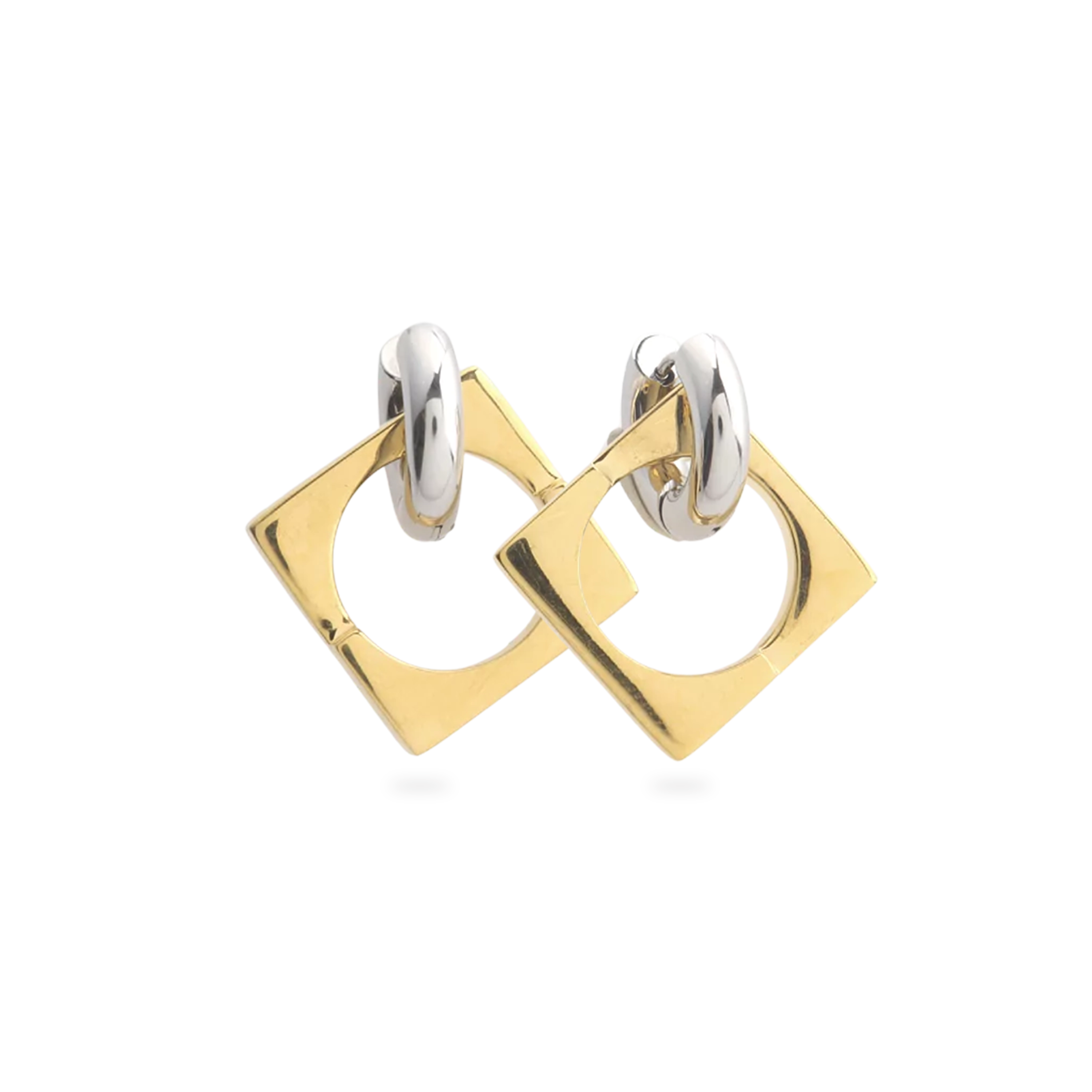 Gold and silver **Square Mix Hoops Earrings**, featuring a modern geometric design with a bold square and circular charm combination.