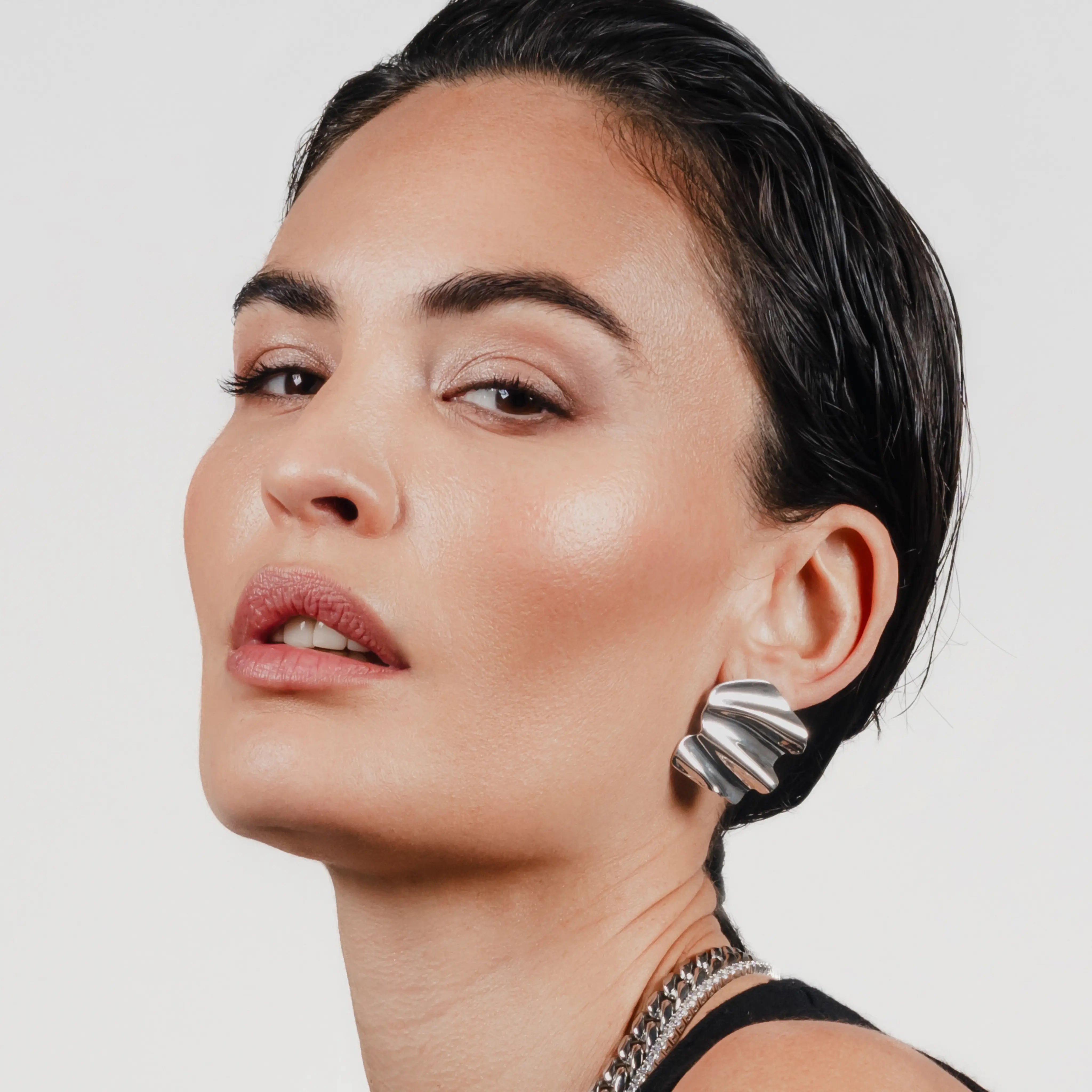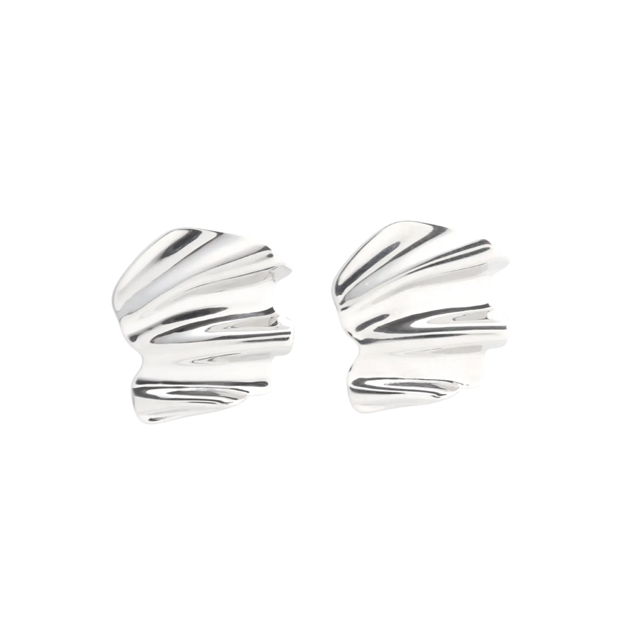 The WAVES OF SILVER EARRINGS, One piece, silver metal, bold shell-shaped earrings worn by model. Simple, elegant design with textured finish.