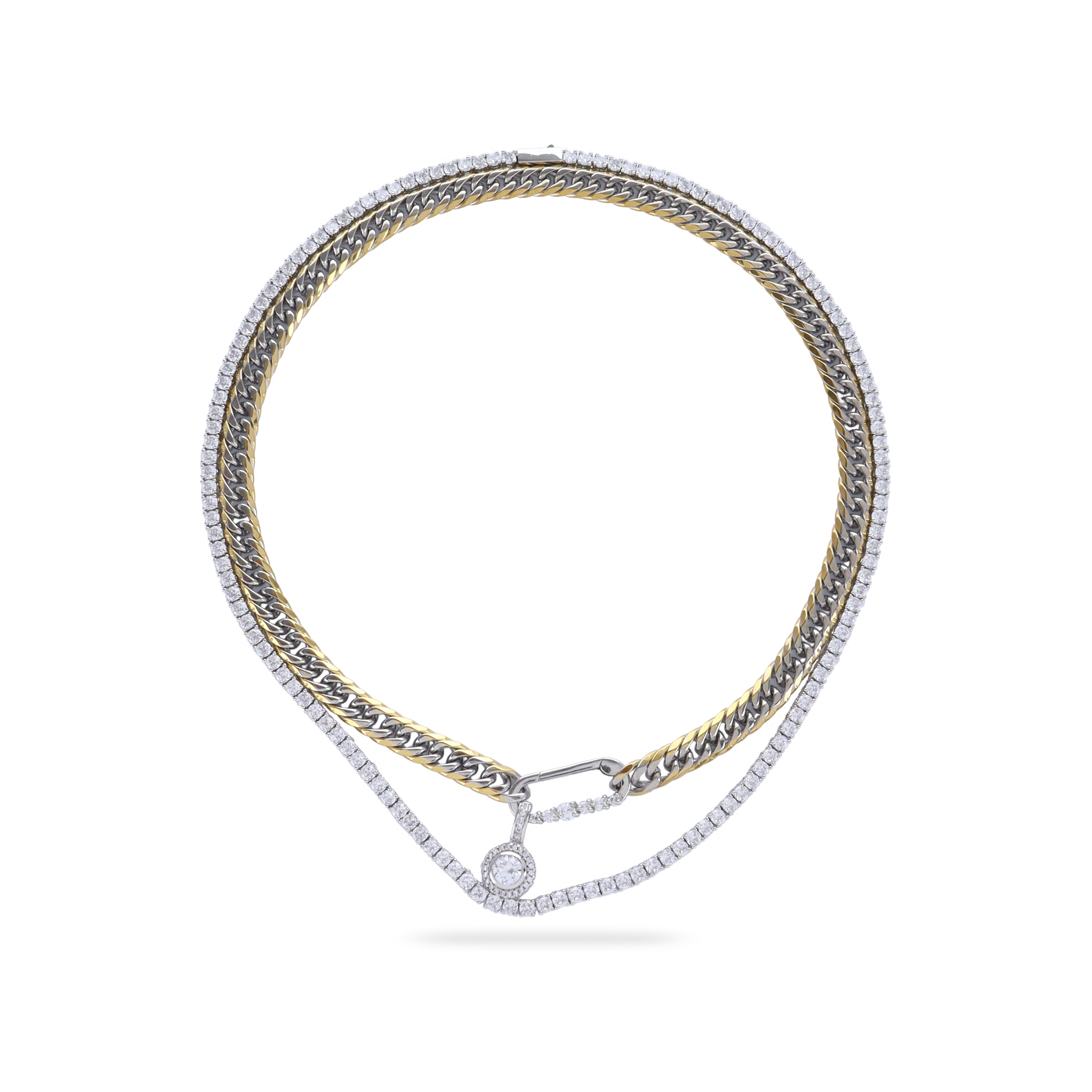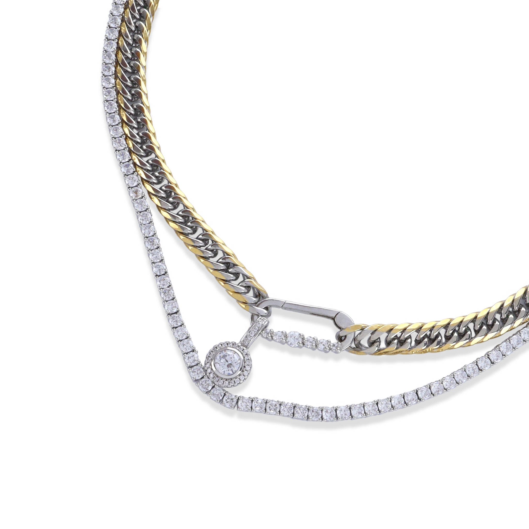 The TENNIS AND THE CURB CHAIN LAYERED NECKLACE SET which is a two-piece layered necklace stack featuring a gold curb chain and a silver tennis chain. ||| GOLD