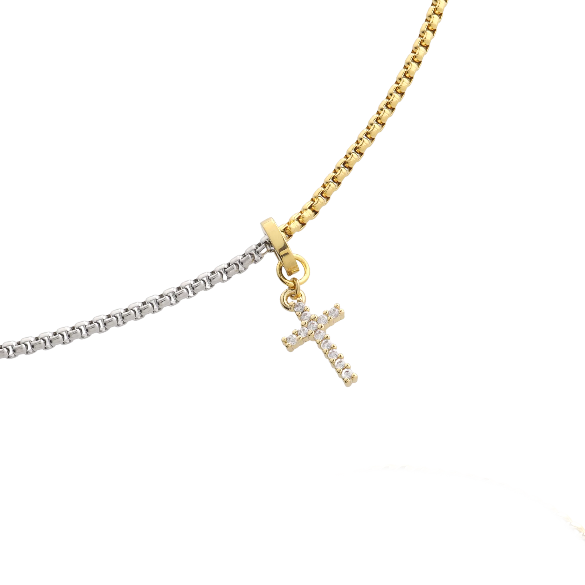 The CHARMED OPPOSITES NECKLACE, a two-tone necklace with half gold and half silver chain, featuring a small cross charm hanging from the center. |||  Cross Charm/MIX