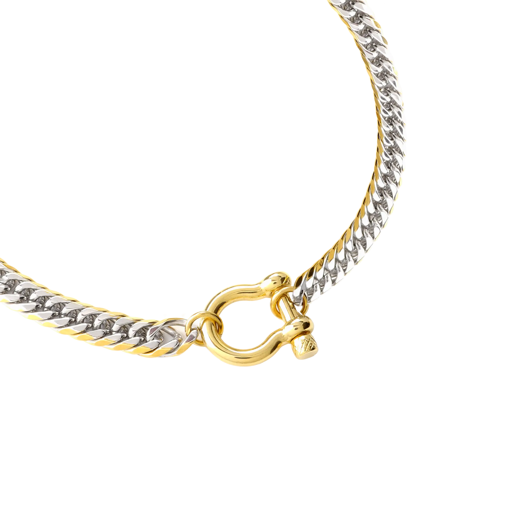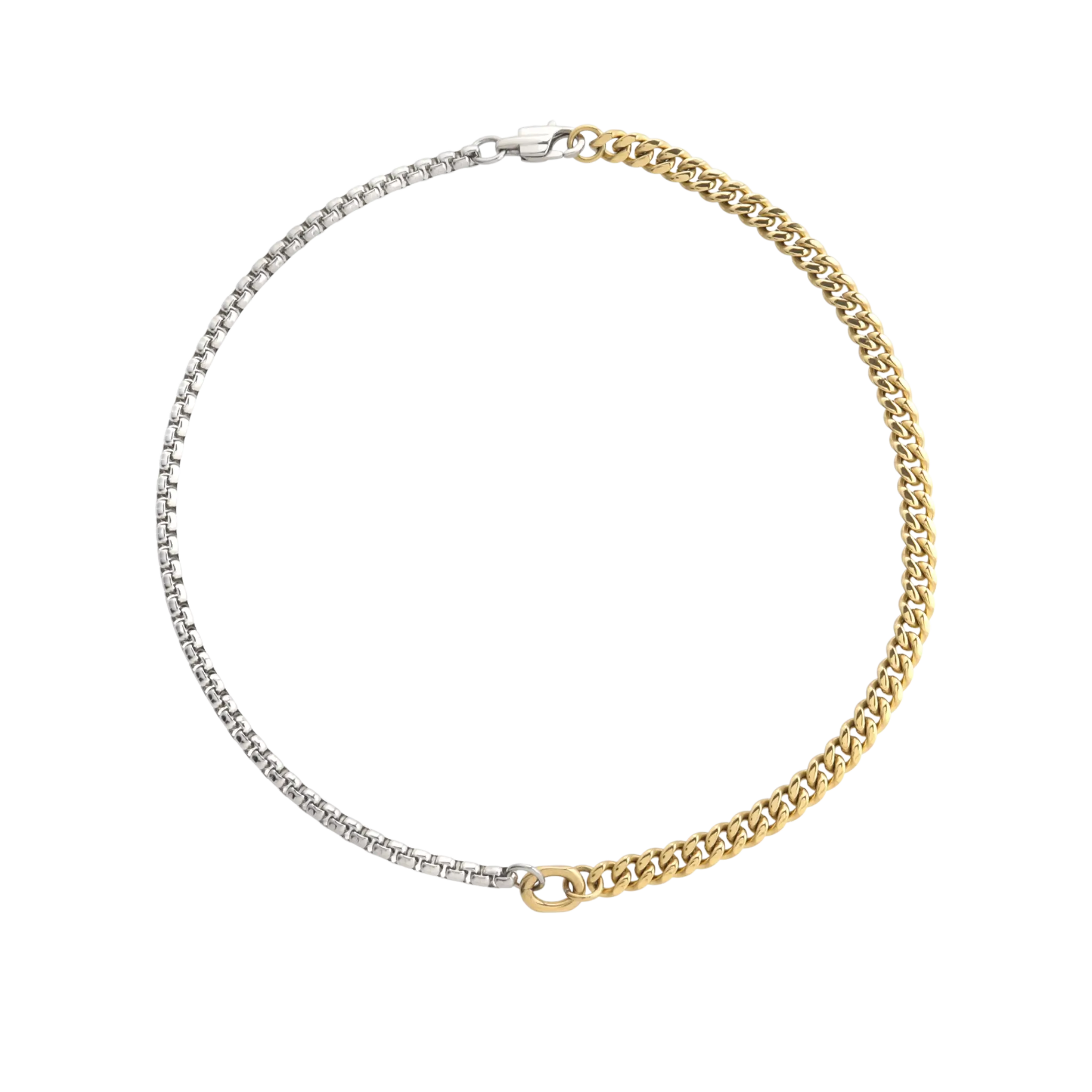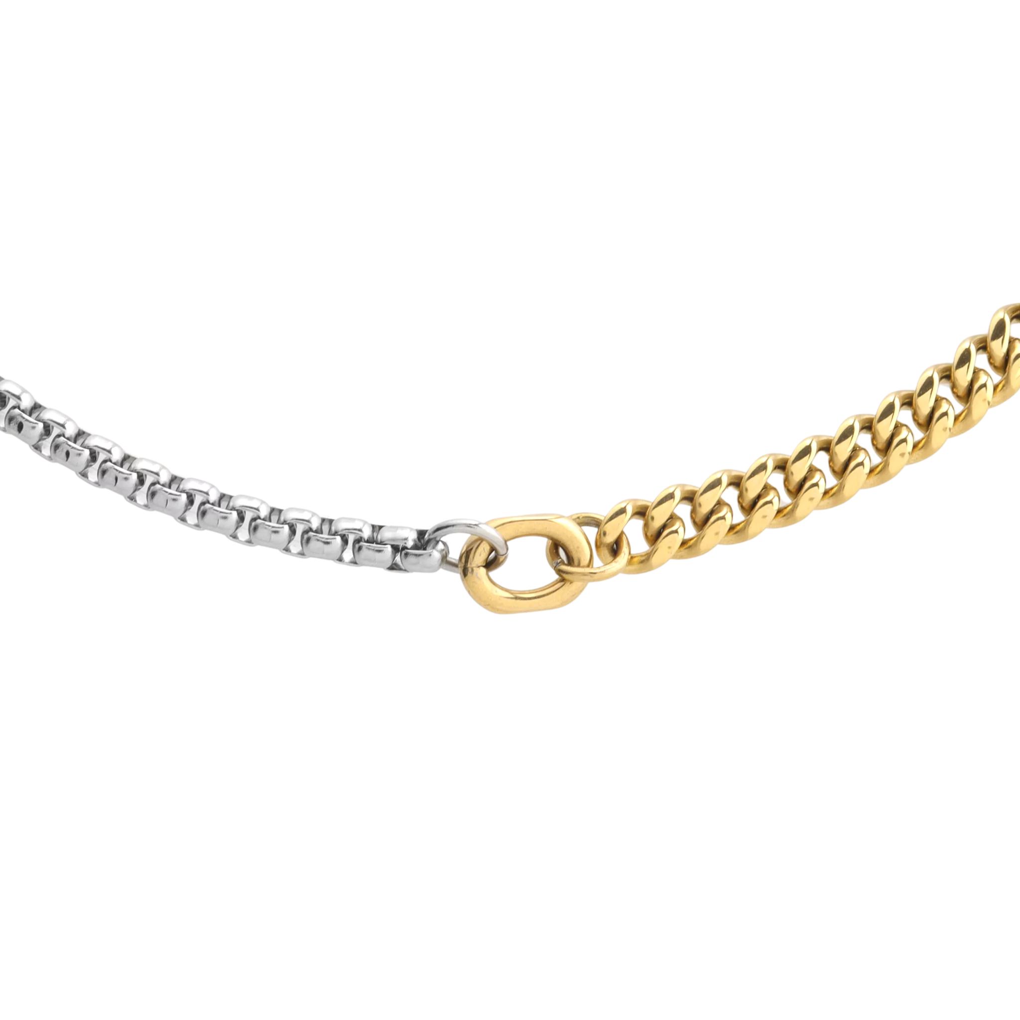 Close-up of OPPOSITES ATTRACT CHAIN NECKLACE, two-tone chain with silver box links on one side and gold Cuban links on the other, joined at the center with a gold oval connector. |||  MIX