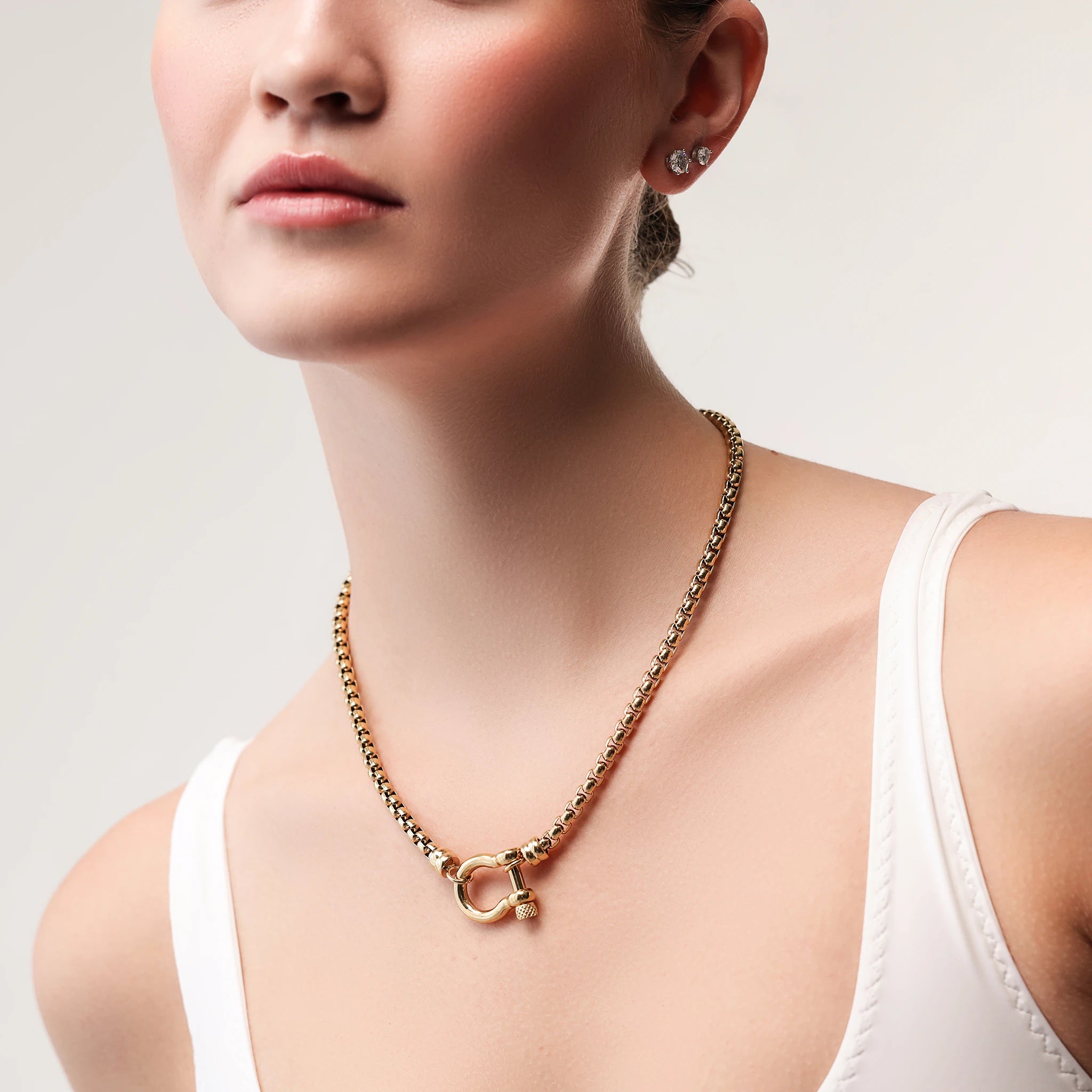 Model wearing the Sleek Carabiner Anne Mix Necklace featuring a bold mixed metal chain with a gold carabiner clasp centerpiece.