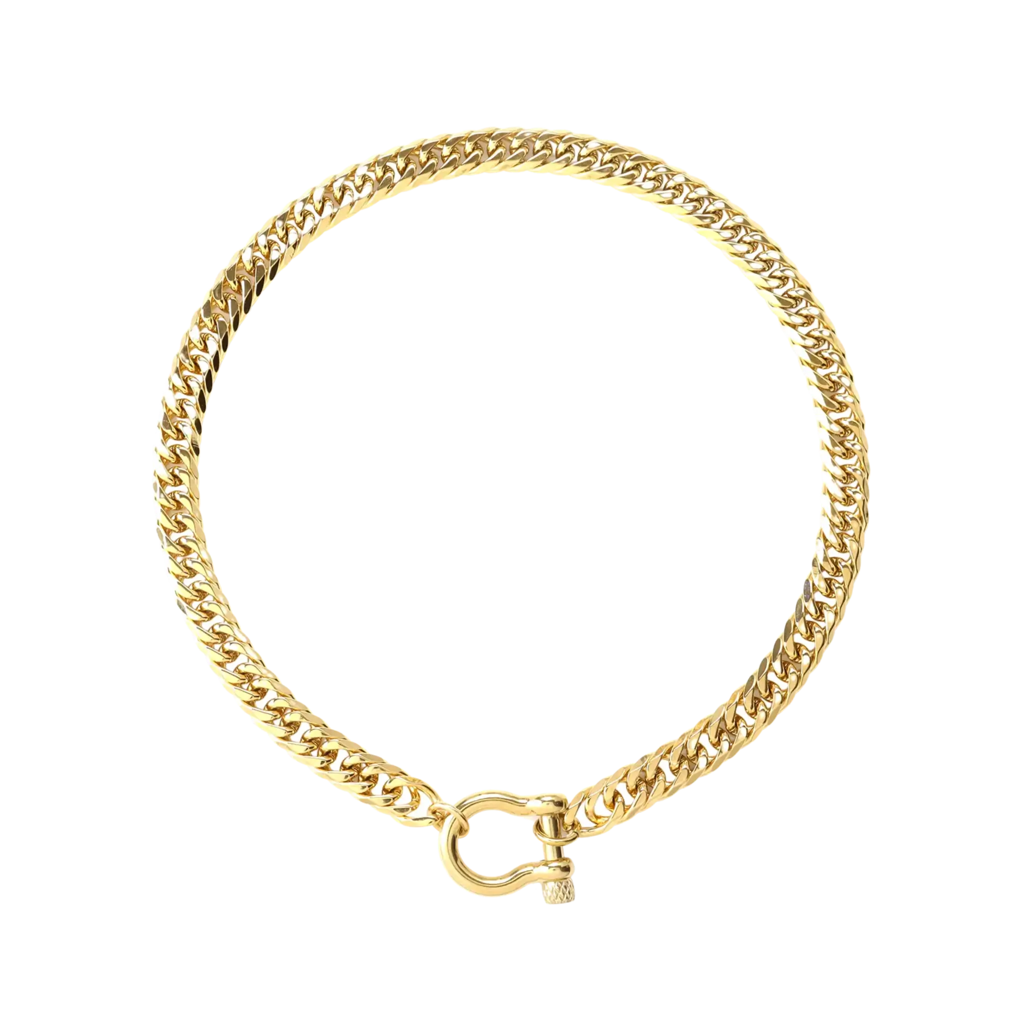 The Sleek Carabiner Anne Mix Necklace, which is a single-piece mixed metal necklace featuring a thick silver chain and a contrasting gold carabiner clasp for a clean, elevated look.
