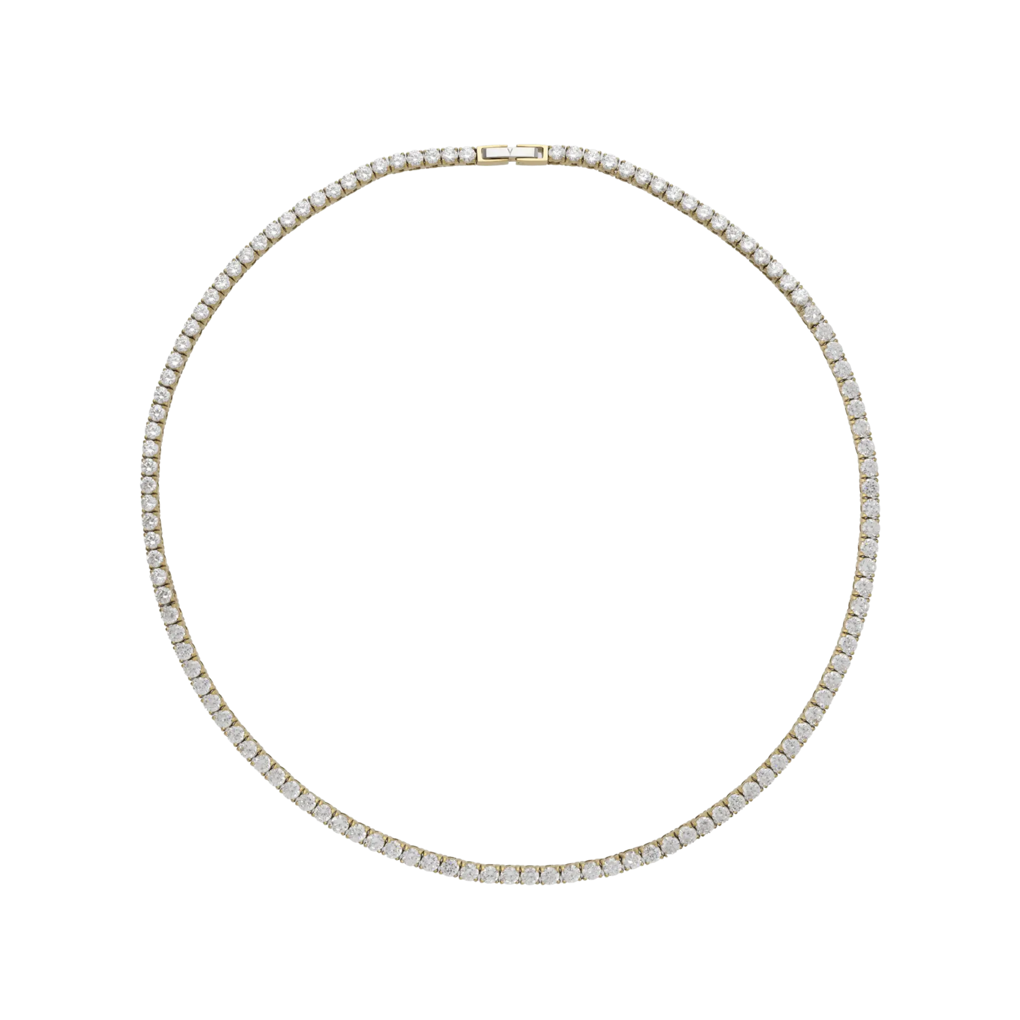 The ROUND CUT RIVIERE TENNIS NECKLACE, which is a single gold necklace featuring round-cut white stones in a classic prong setting. Not layered or worn by a model.