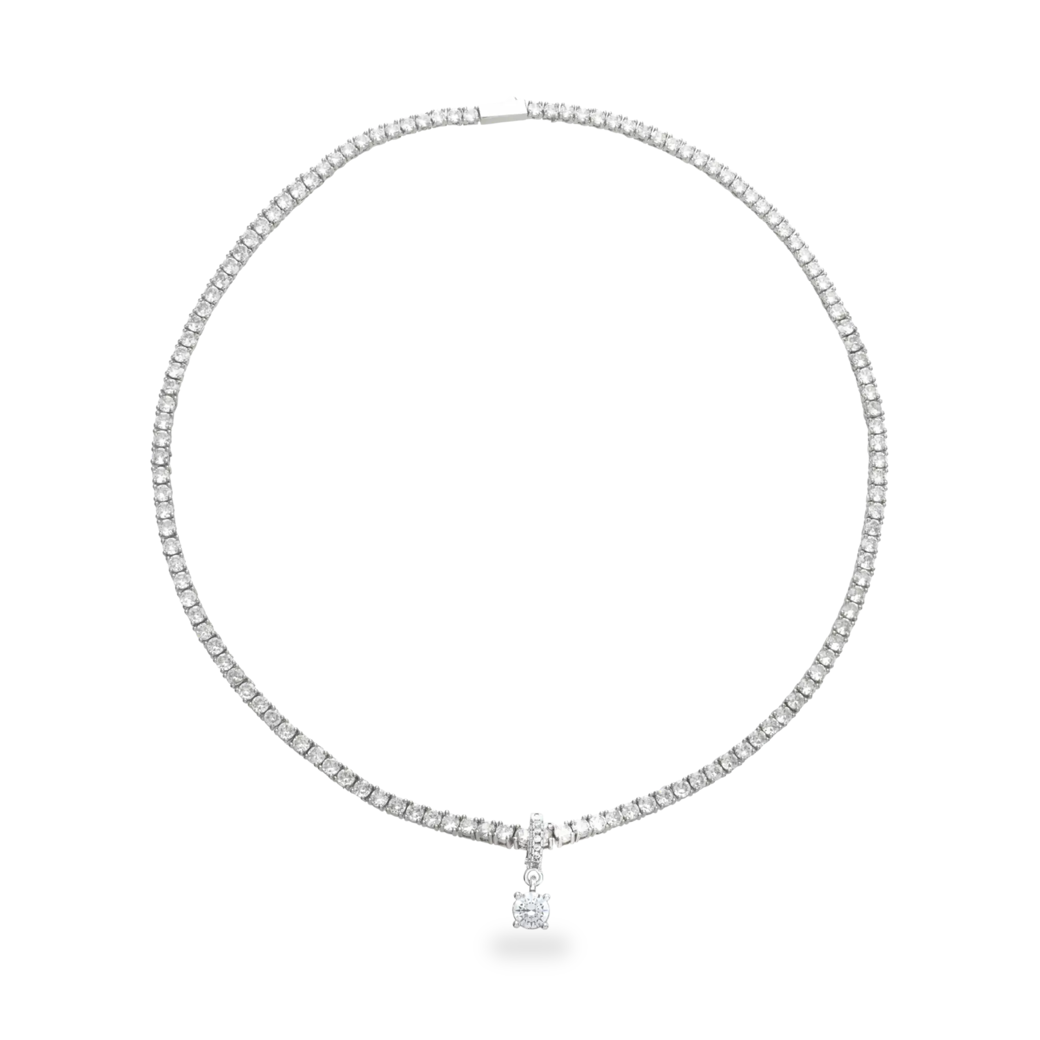 The Solitaire Tennis Necklace, which is a single silver tennis necklace featuring a round-cut solitaire pendant at the center.