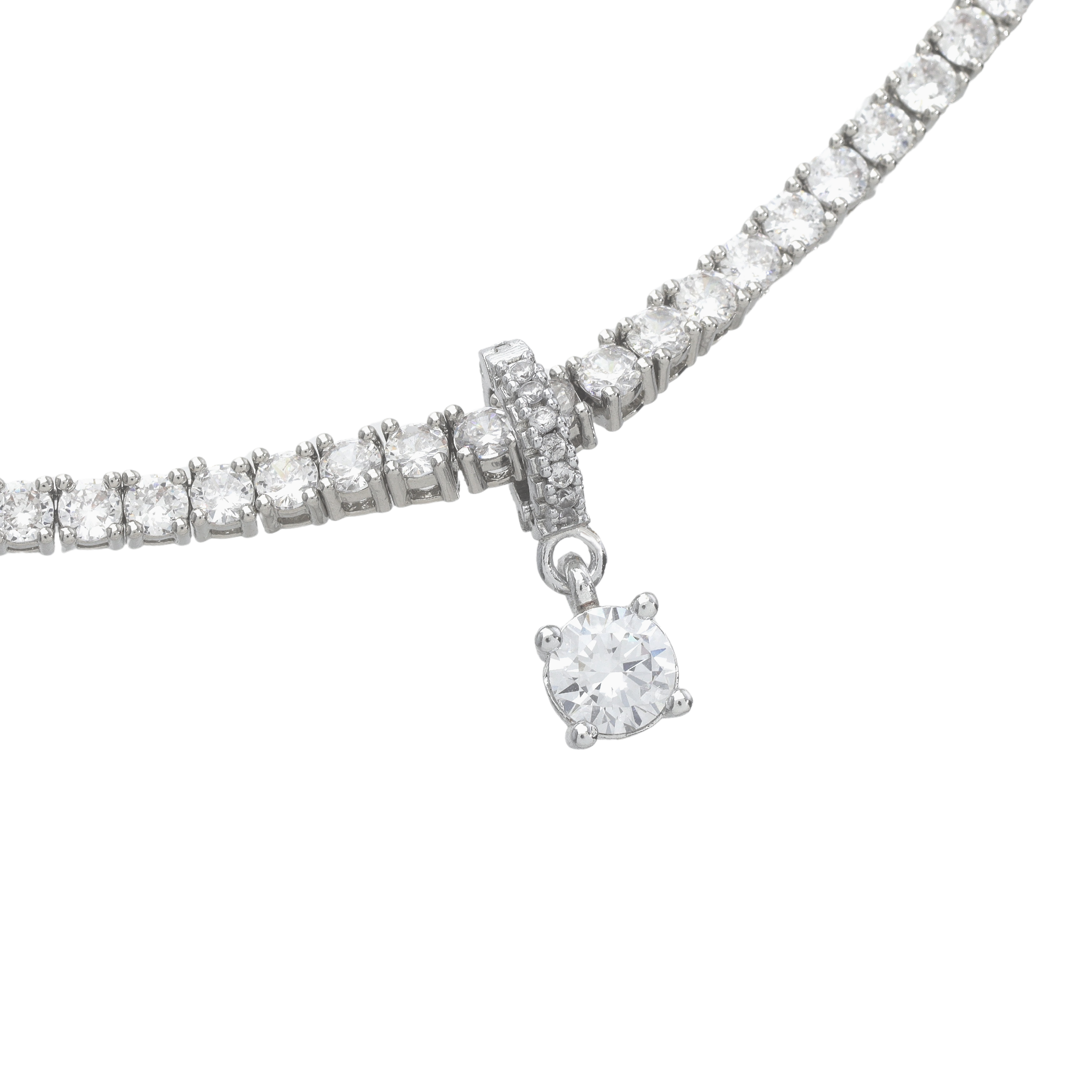 Close-up of the Solitaire Tennis Necklace, which is a single silver necklace with round-cut stones and a center solitaire pendant.