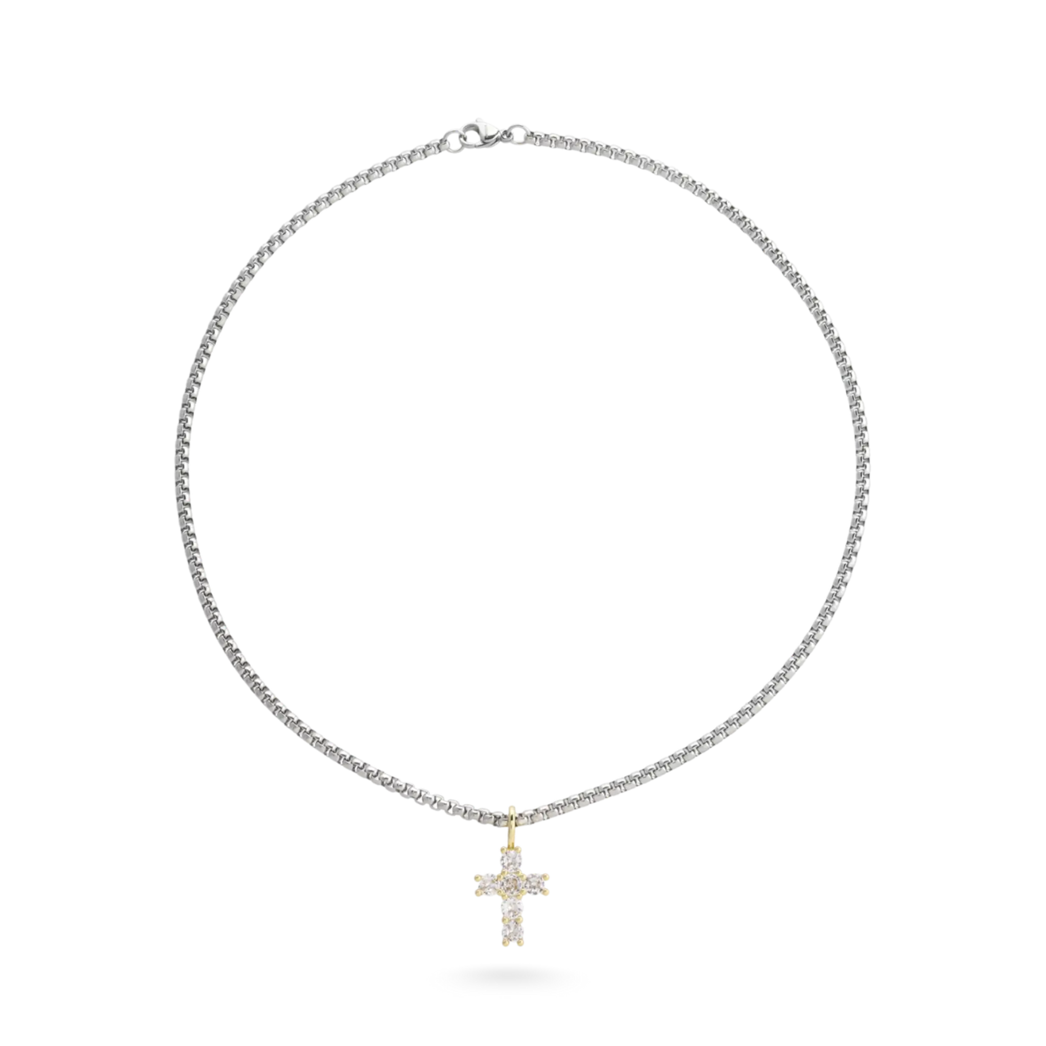 Charmed Opposites Necklace featuring a two-tone gold and silver box chain with a pavé cross charm at the center. |||  Cross Charm/MIX